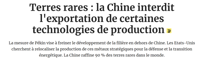 D’autant que les Chinois jouent de cette position dominante... et ont déjà réduit leurs ventes de terres rares et de technologies à l'étranger - en 2000, 2010, 2011...⤵️