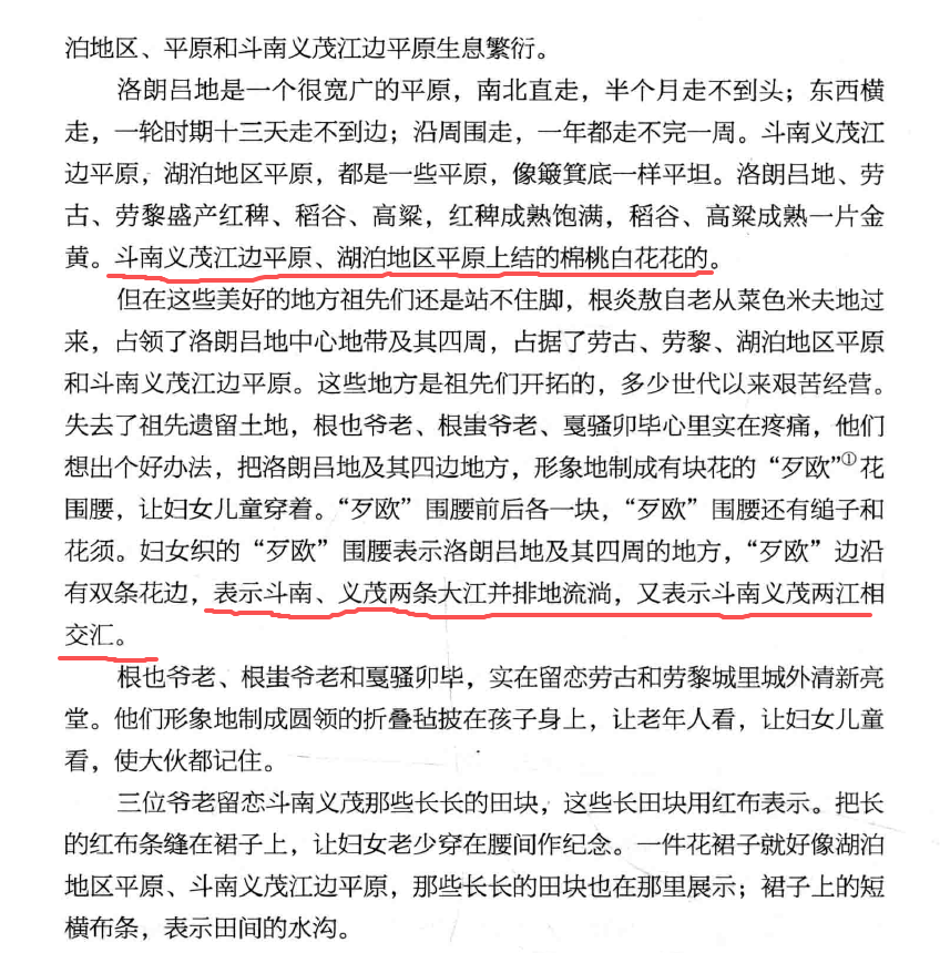 苗人在首领的带领下,沿河流和山脉向东方迁徙,终于找到了东方的“直米力利磨平原”,又称“洛朗吕地”、“中球·吉楚水乡”、“甘挡底益捧平原”、“斗那义慕大平原”。