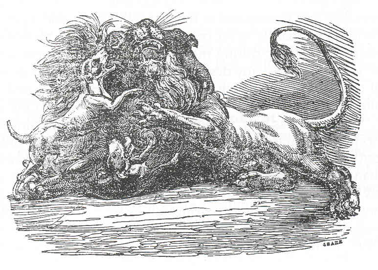 The first of two of Wombwell's fights before the public was between the lion Nero and several of these ravening dogs.
