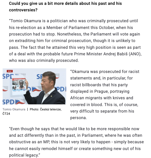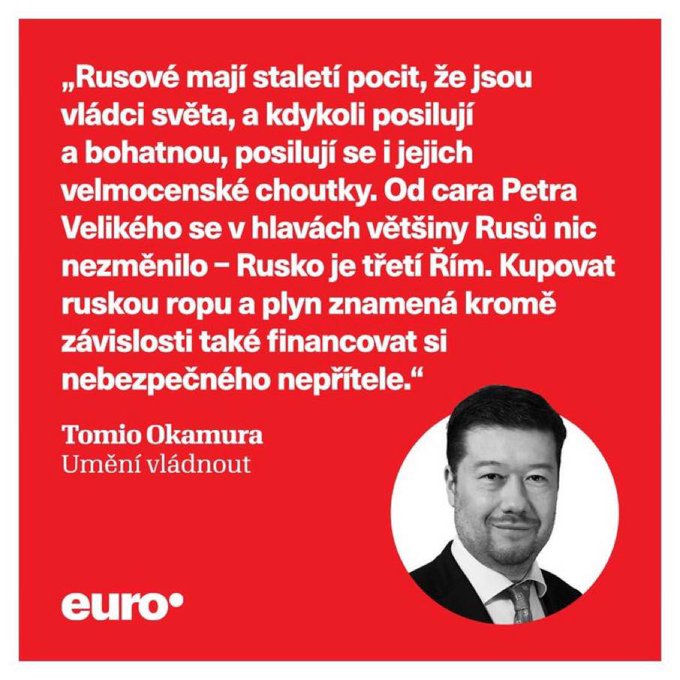 Okamura je tak v přímém rozporu s naší historií a hodnotami: Česko vstoupilo do NATO v roce 1999 a do EU v roce 2004; členství v EU bylo schváleno v referendu v roce 2003 77 % hlasů, zatímco NATO má podle posledních průzkumů podporu 86 %.