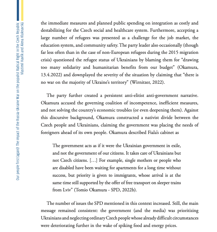 … ukrajinských uprchlíků. Většina z nich pracuje, platí daně a páchá méně trestné činnosti než jiné skupiny. Ale zatímco si Česko zvolilo solidaritu, Okamura si zvolil nenávist a barví uprchlíky jako konkurenty o peníze, a nikoli jako lidi prchající před ruskou agresí.
