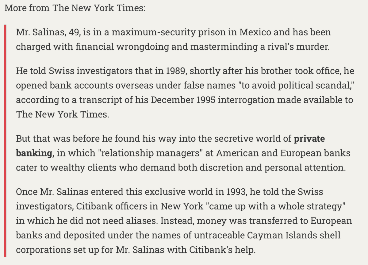 There is a Bitcoin link. Raúl Salinas de Gortari, Carlos's brother, loaned Ricardo Salinas Pilego 29 million to buy TV Azteca during his presidency, leading to later investigations and public scrutiny.