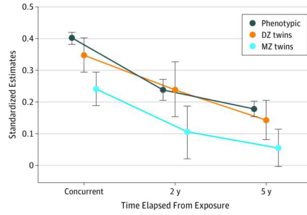 In the first study you cited, effects on monozygotic twins were non-significant after adjusting for pre-existing psychopathology. In the second, it seems obvious the effect is acute, and likely does not influence longterm outcomes.