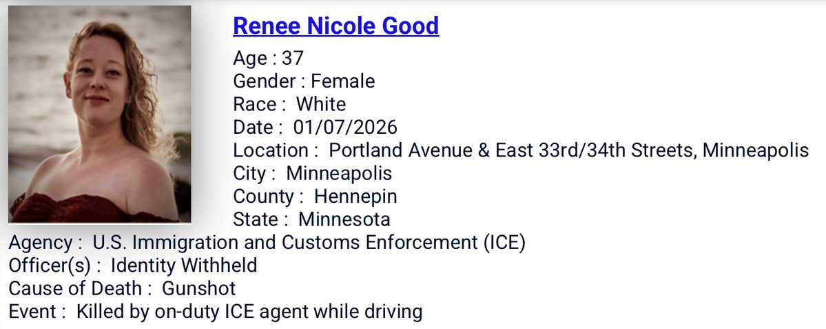 1/7/2026: Renee Nicole Good, 37, shot and killed by ICE agents while attempting to drive away from ICE agents swarming during immigration raid. All details known so far and video are in link. incarcernation.com/view-for-death…