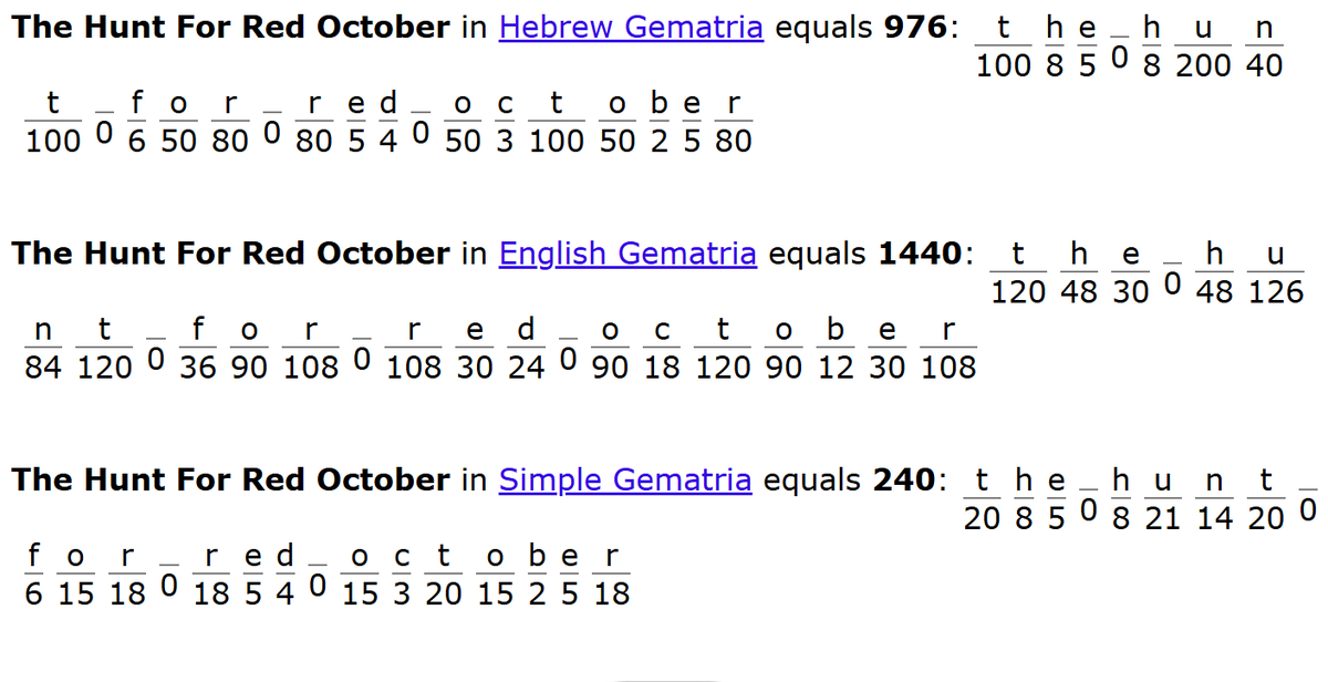 Since @farawayanon and I have had so many recent decodes containing RED OCTOBER ๐งs, I thought I would check the gematria & it's super spicy๐ถ๏ธ๐ถ๏ธ