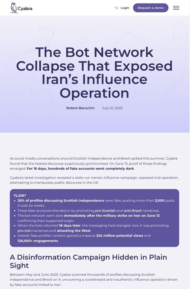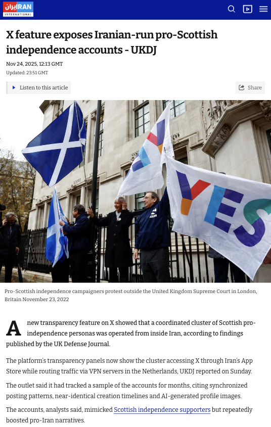 Iran’s influence operations are smaller than Russia’s or China’s, but they pursue similar goals. One example: an Iran-linked troll farm targeted Scottish independence, pushing divisive narratives to weaken the UK and distract Western governments.