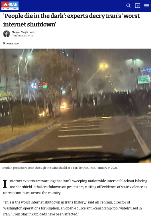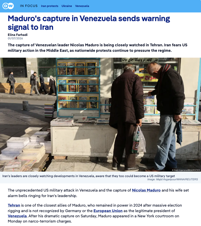 Internet access is still possible using smuggled Starlink terminals (it’s illegal of course), but the regime has been jamming that as well. The violent response has even prompted a warning from Trump, who just took down Maduro, a key ally of Iran.