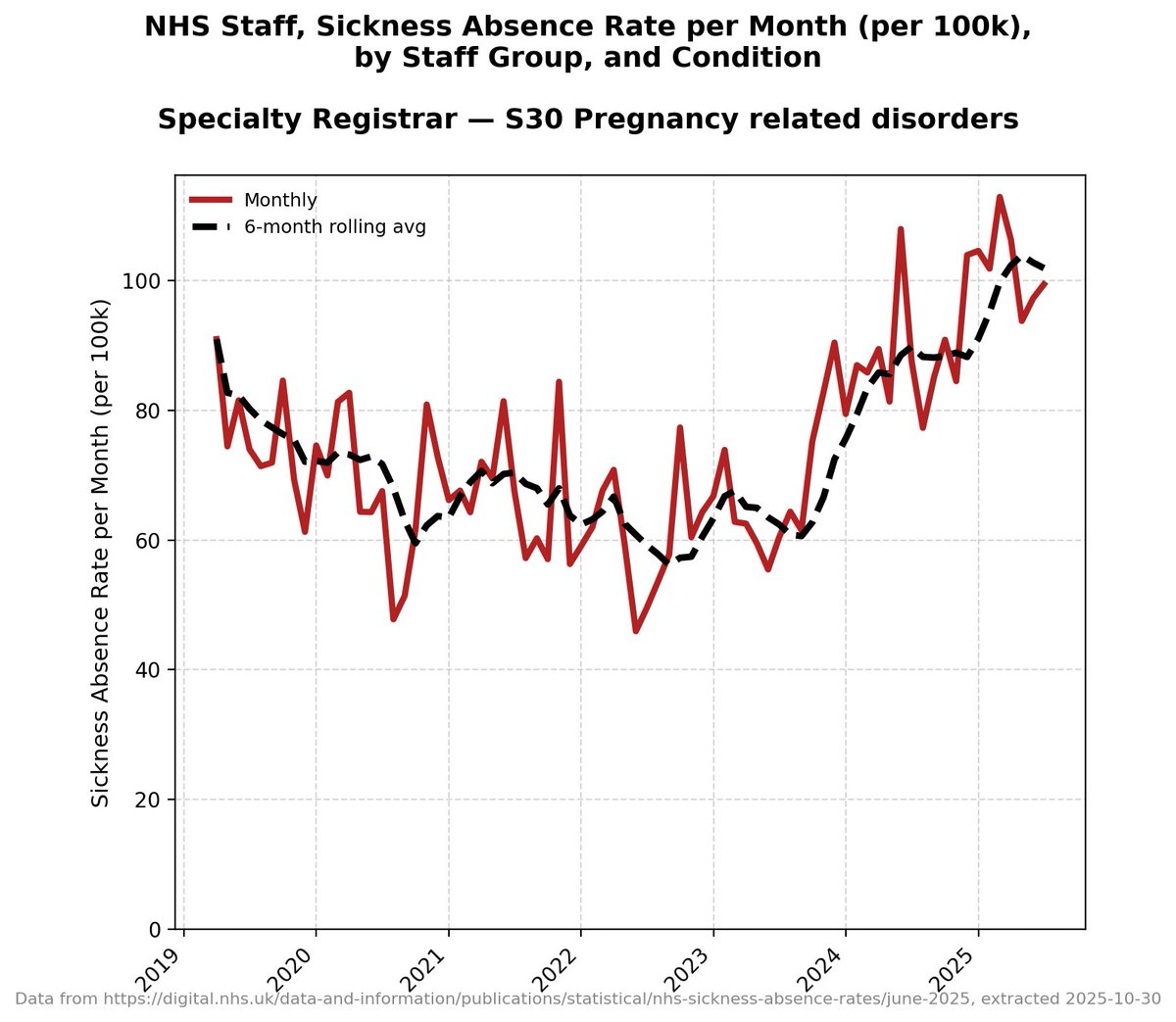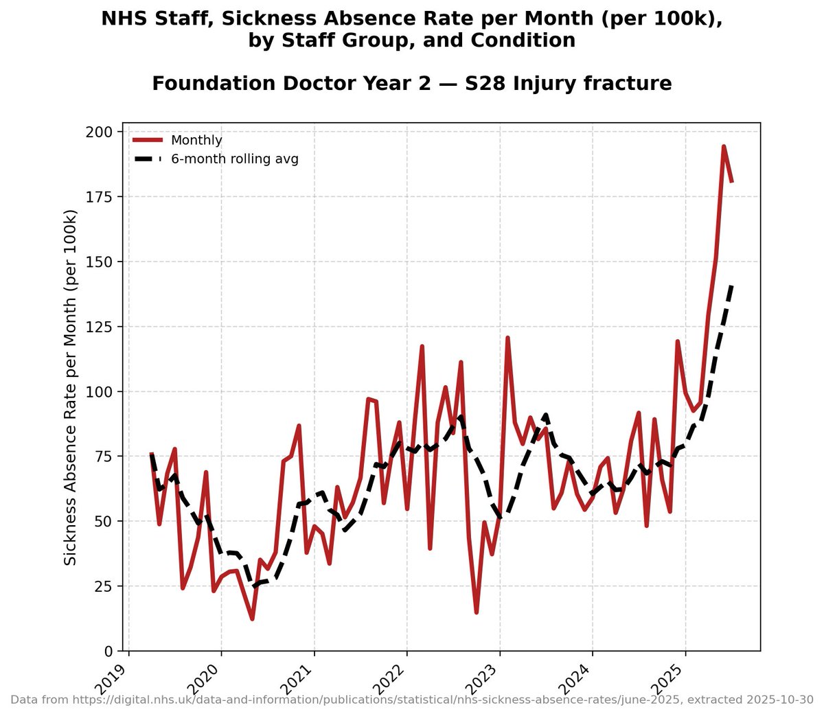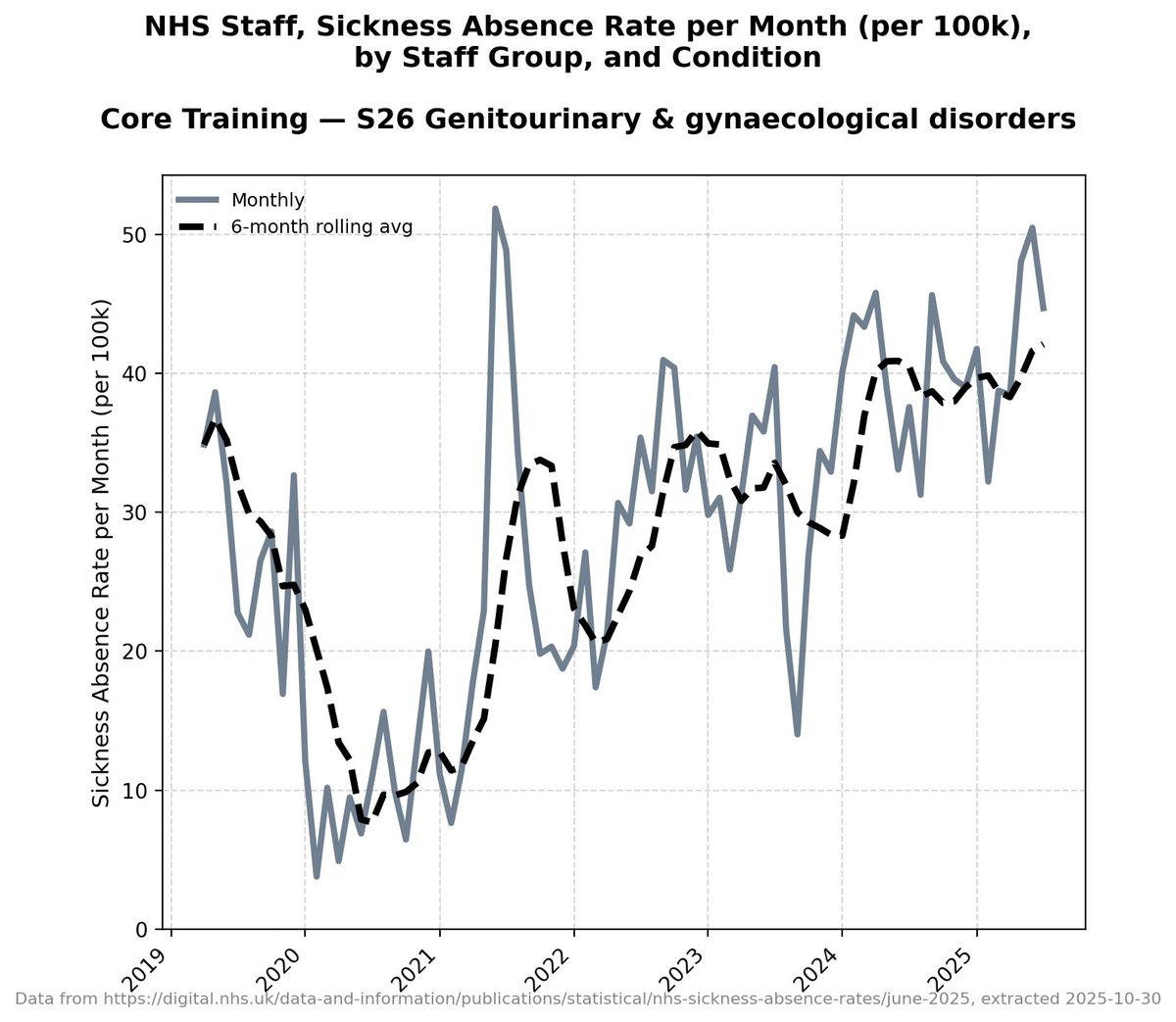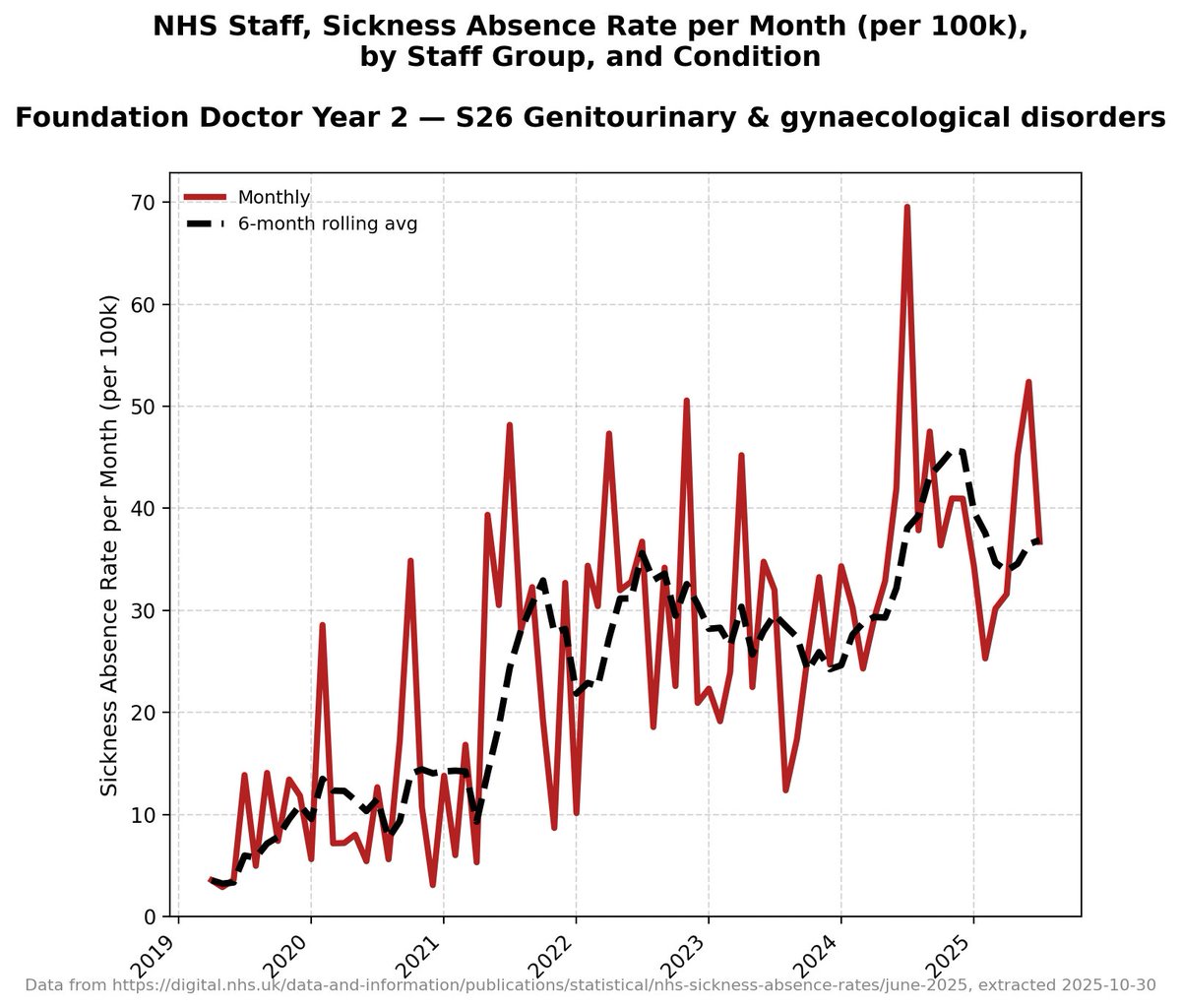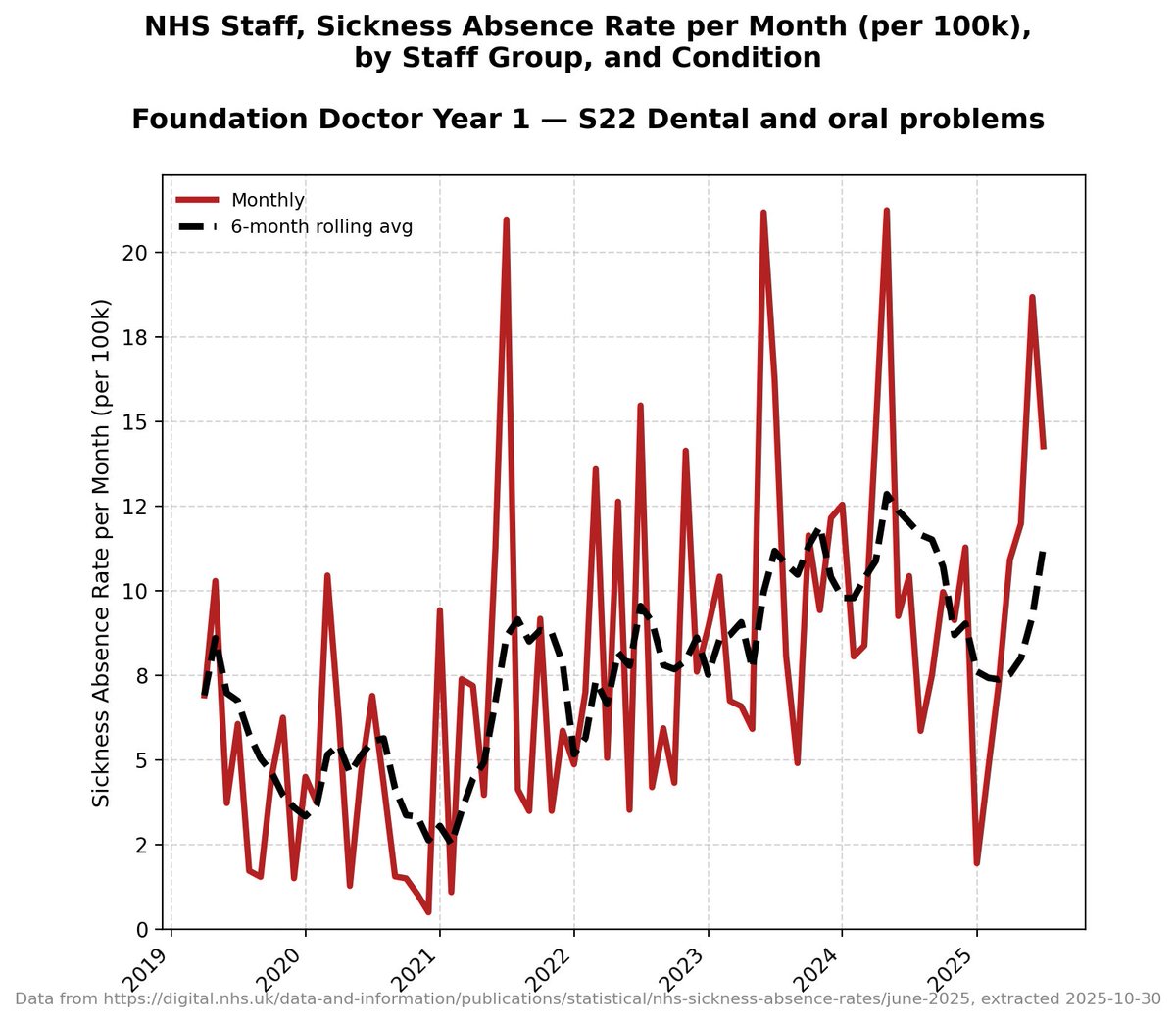 It's worth pointing out that there isn't this granular detail for each band of doctors in the NHS data - this detail only starts in 2019 - but all other data *suggests* that before 2019 these absences were *very consistent and level*.