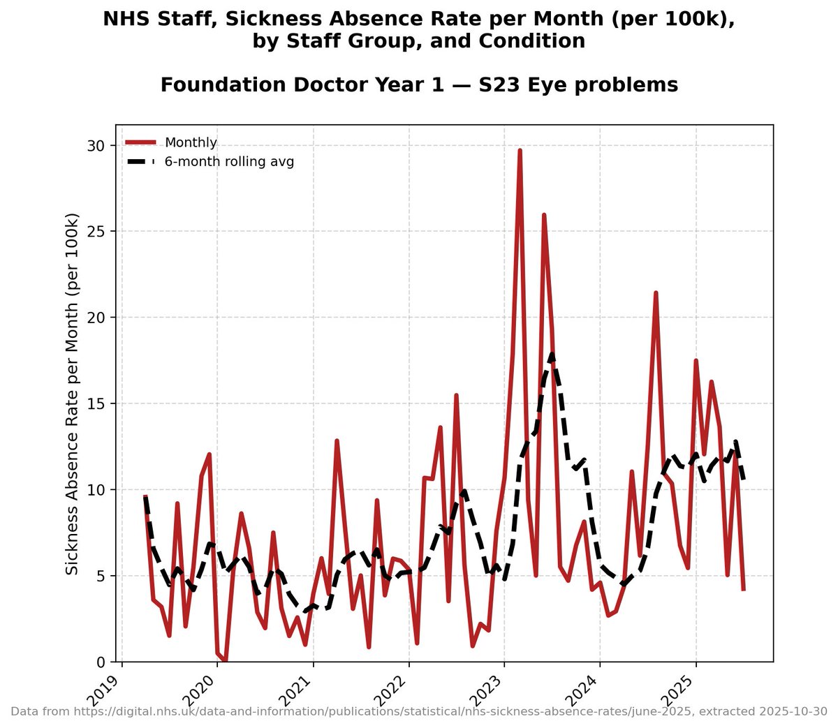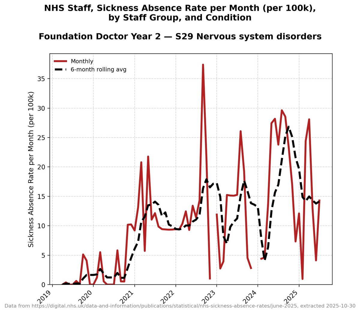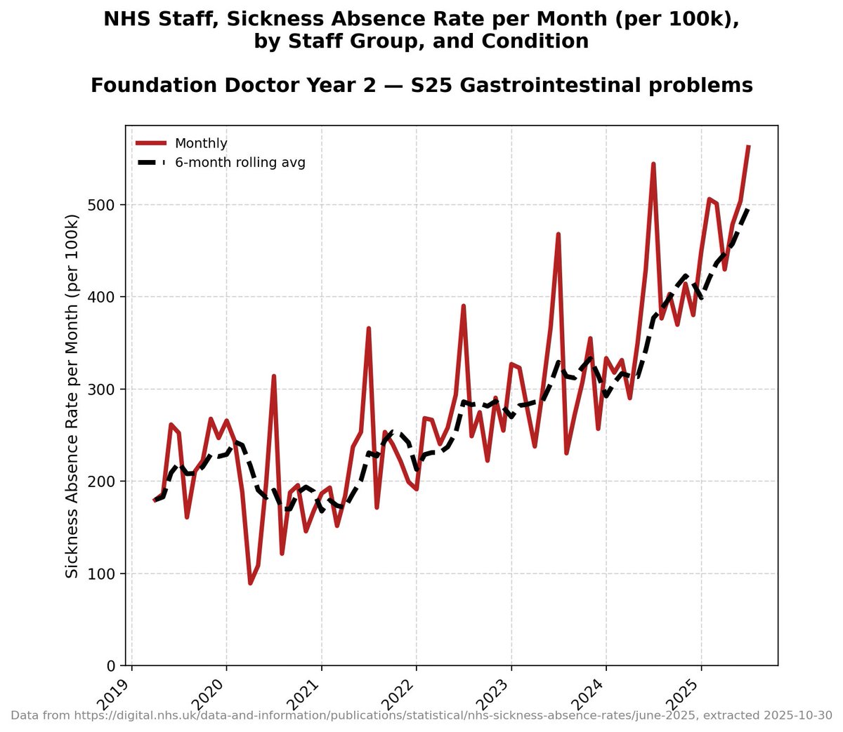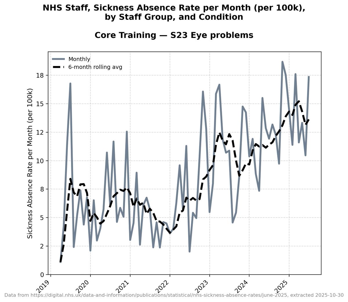 It's worth pointing out that there isn't this granular detail for each band of doctors in the NHS data - this detail only starts in 2019 - but all other data *suggests* that before 2019 these absences were *very consistent and level*.