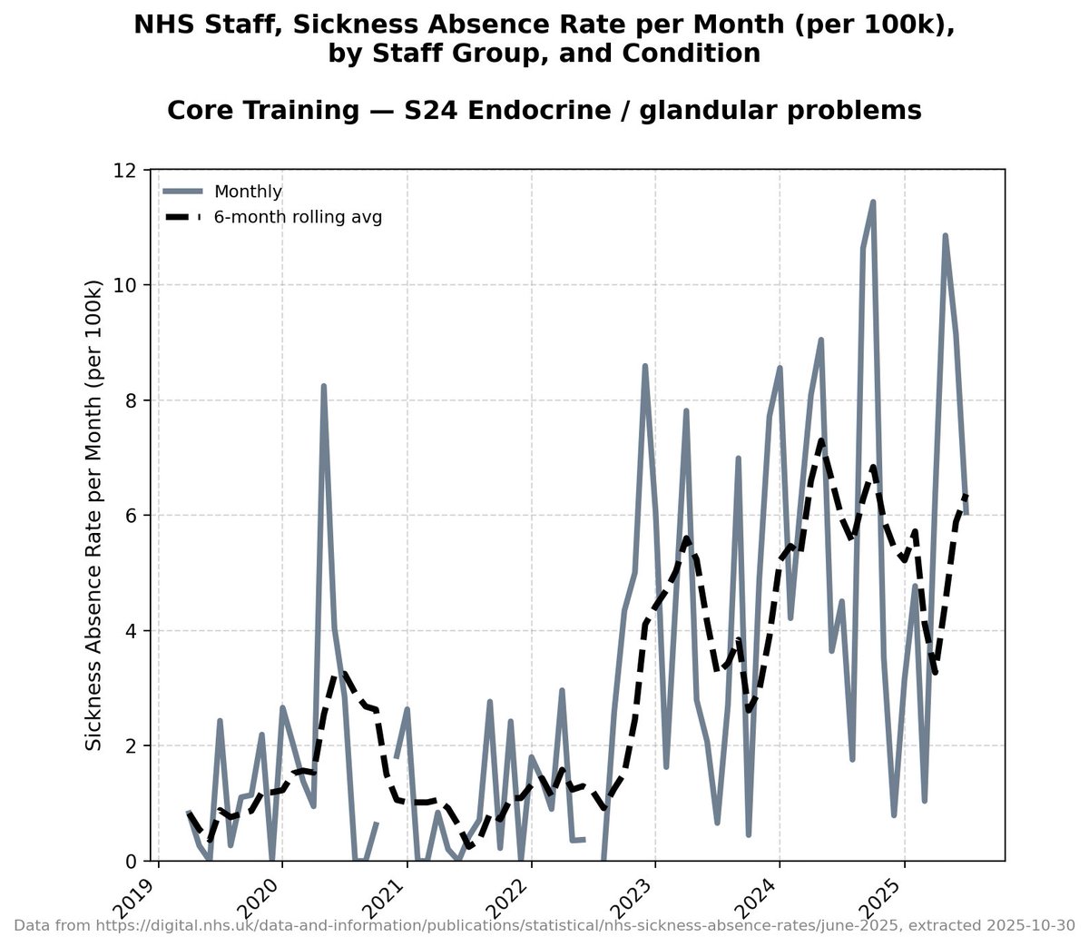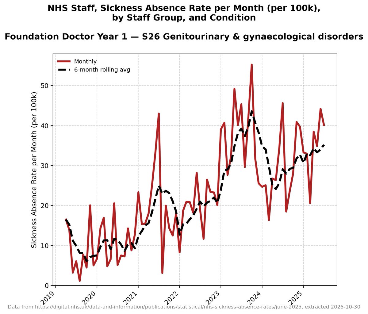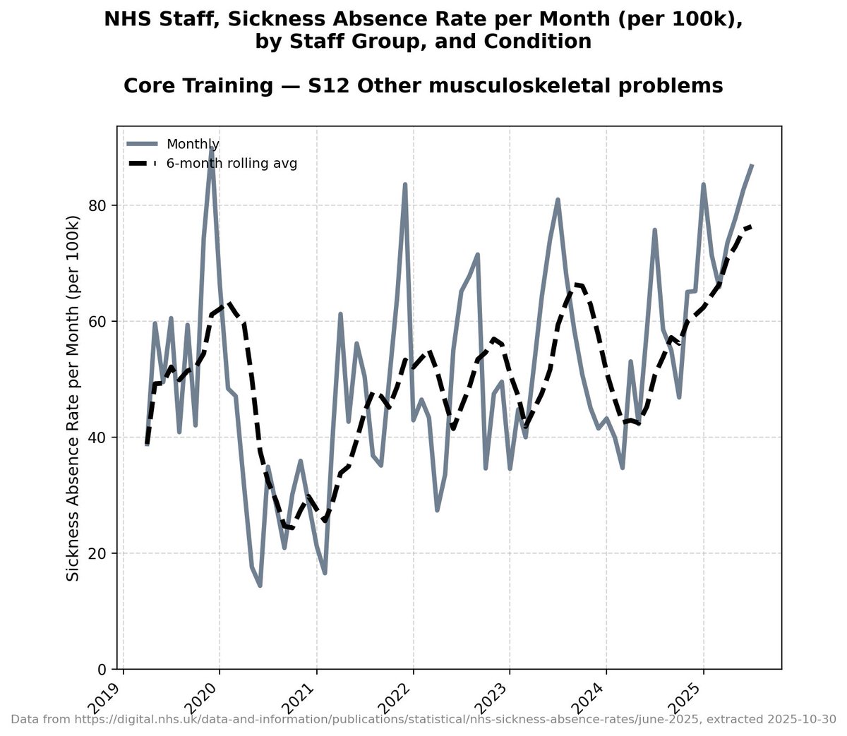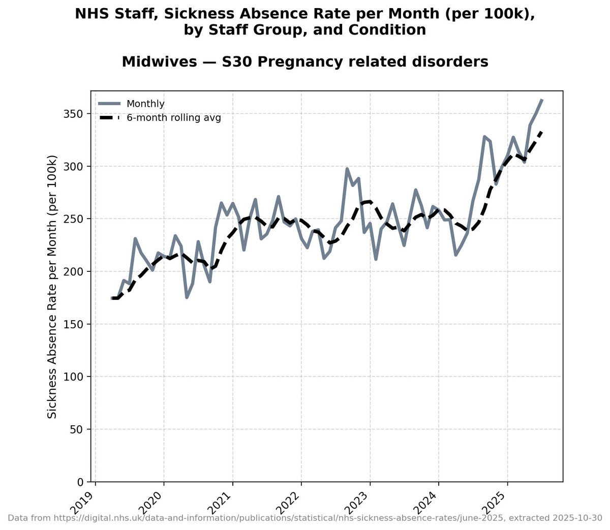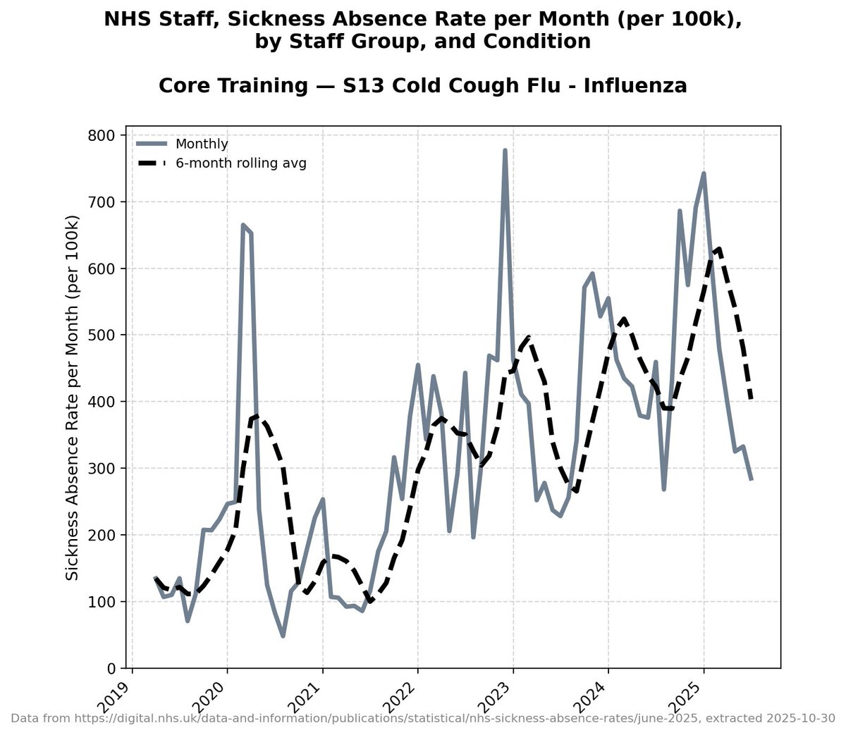 It's worth pointing out that there isn't this granular detail for each band of doctors in the NHS data - this detail only starts in 2019 - but all other data *suggests* that before 2019 these absences were *very consistent and level*.