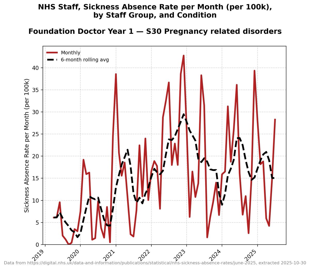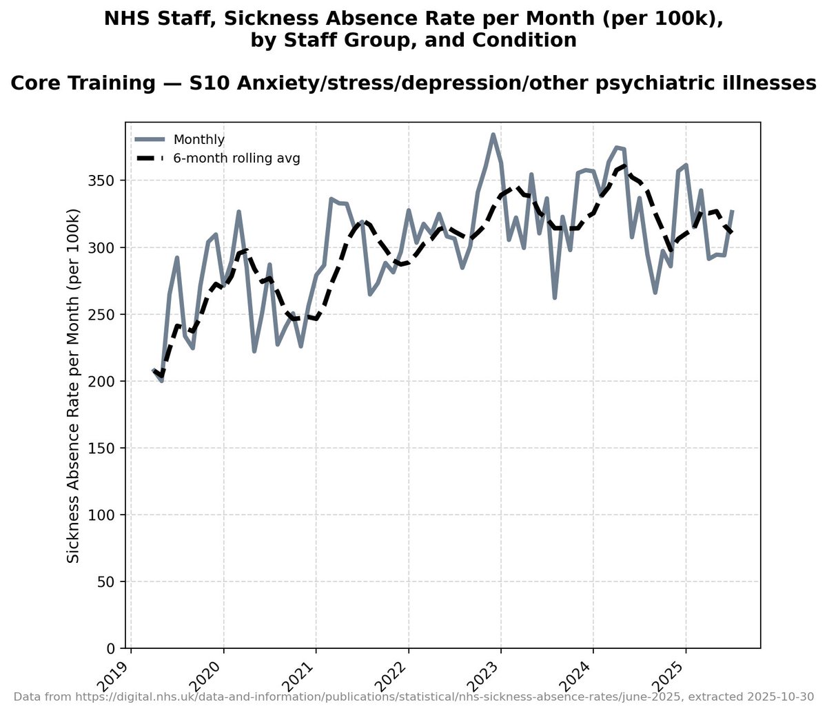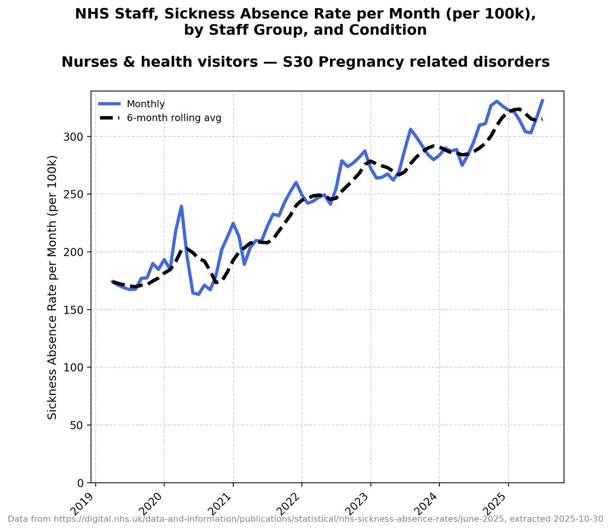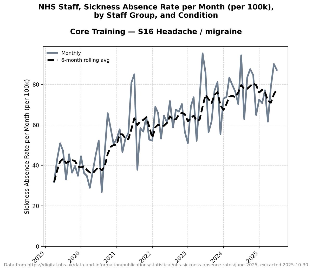 It's worth pointing out that there isn't this granular detail for each band of doctors in the NHS data - this detail only starts in 2019 - but all other data *suggests* that before 2019 these absences were *very consistent and level*.
