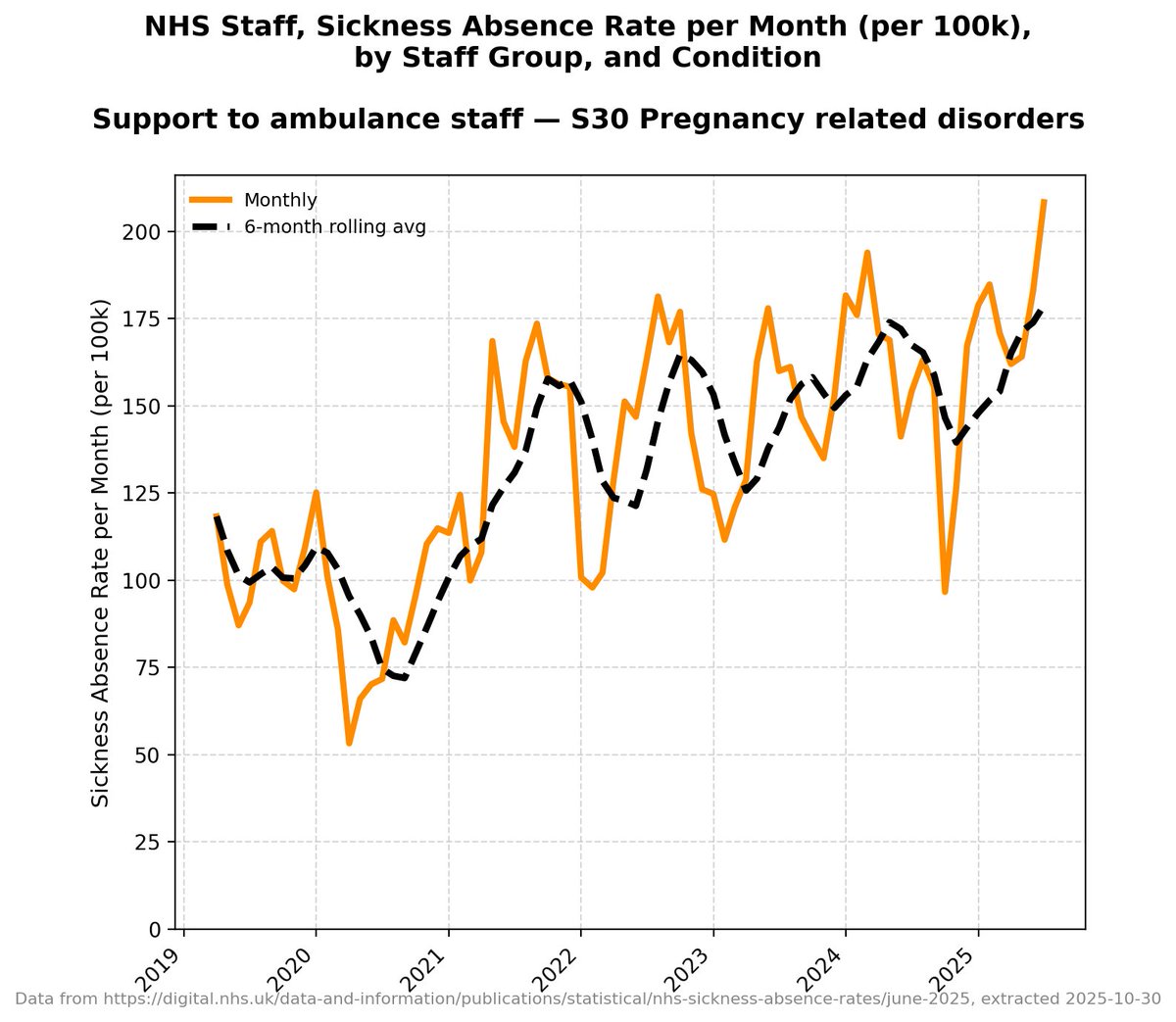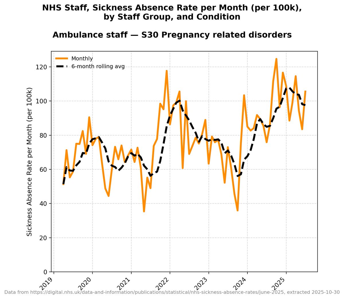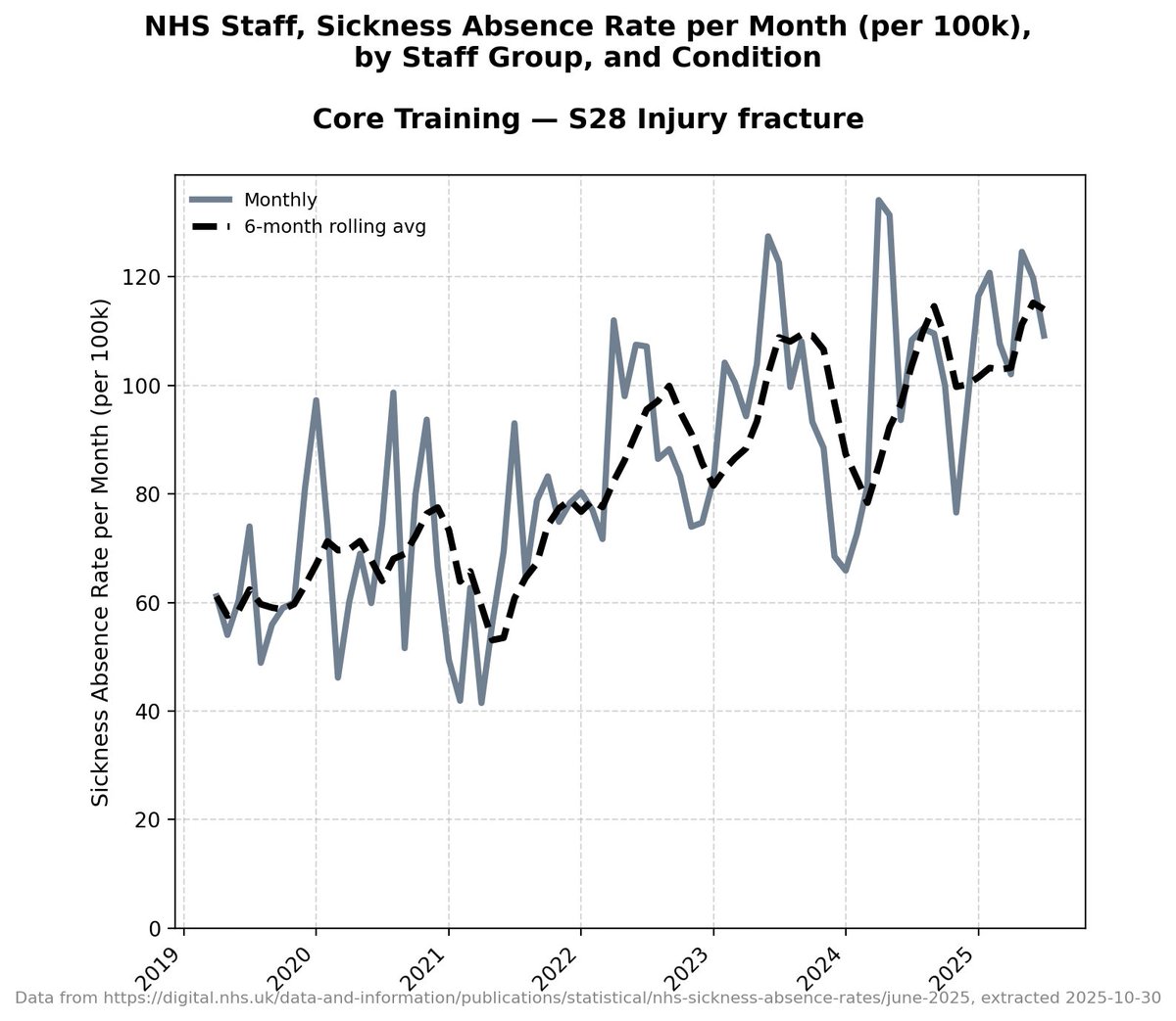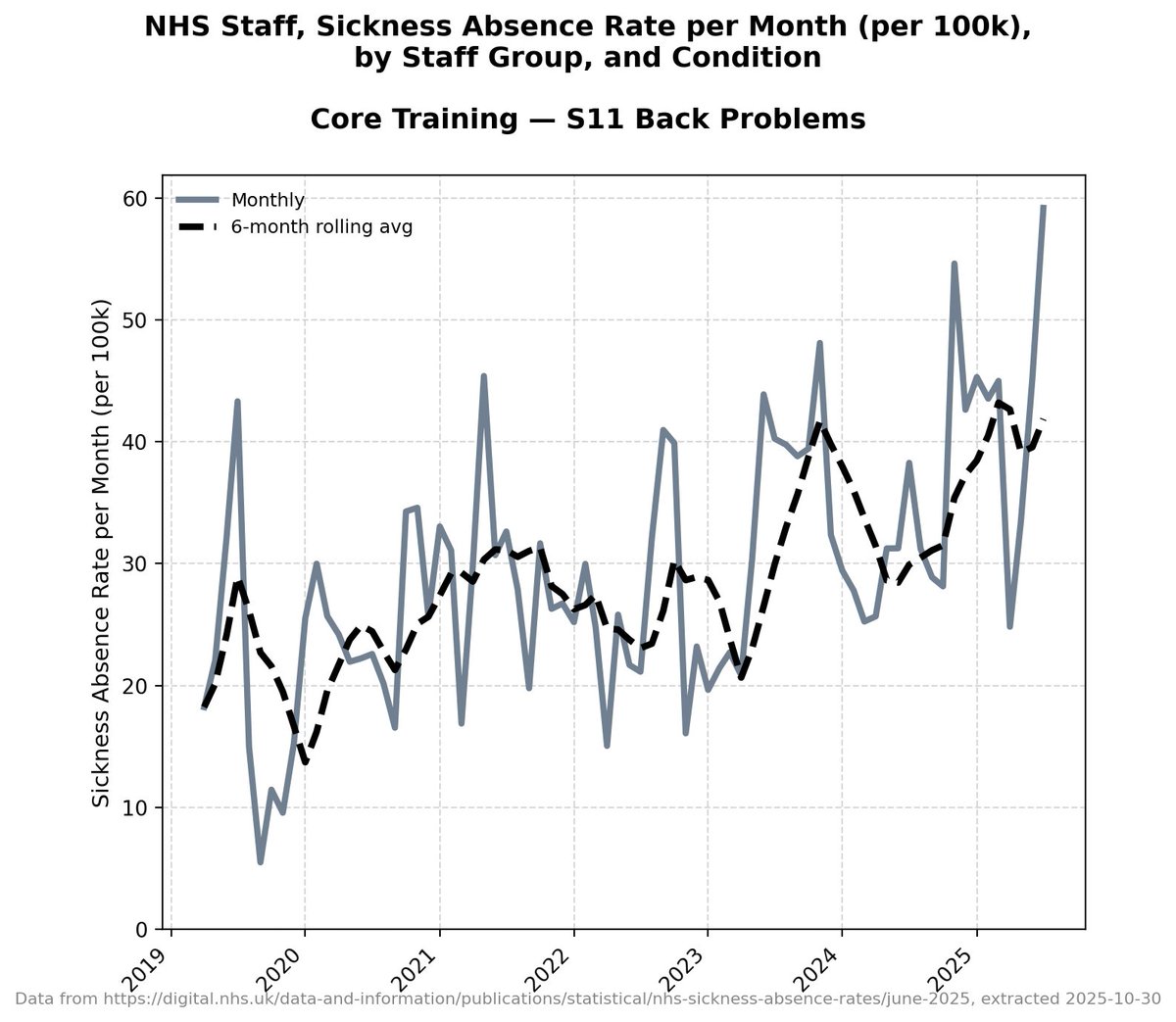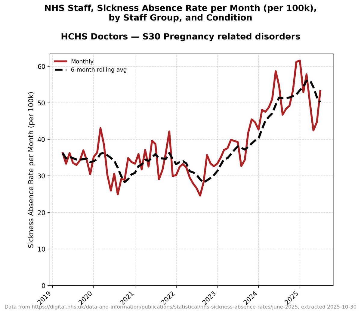 It's worth pointing out that there isn't this granular detail for each band of doctors in the NHS data - this detail only starts in 2019 - but all other data *suggests* that before 2019 these absences were *very consistent and level*.