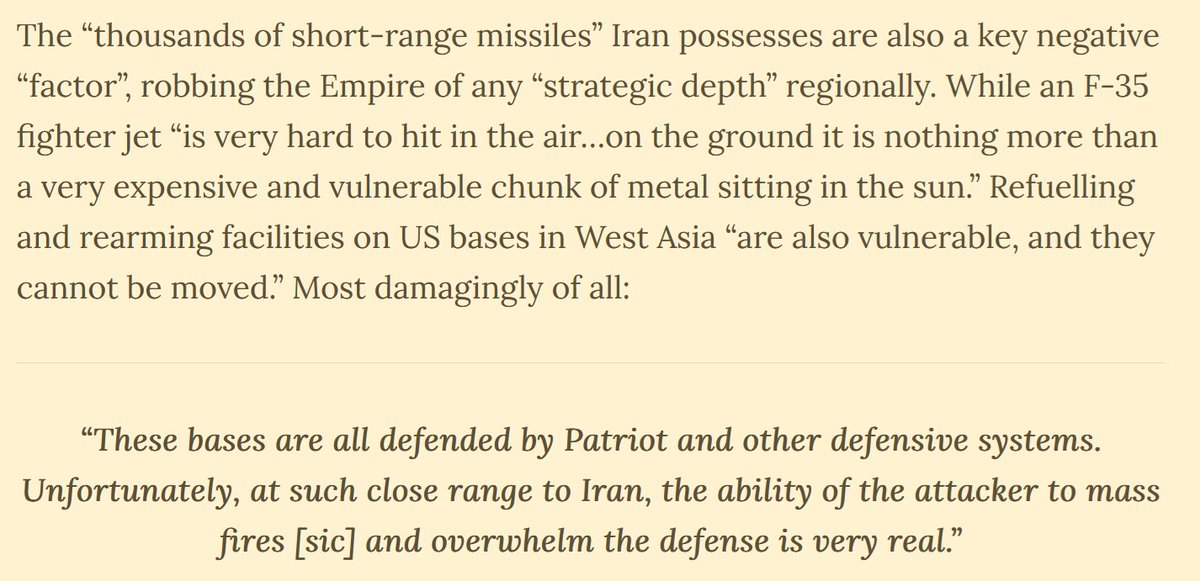JINSA estimated it would take "five minutes or less for missiles launched from Iran" to hit America's West Asian bases. Any jets parked there are toast. And Iran's ability to "overwhelm" missile defence systems was "very real". We may be about to see this happen. Popcorn ready! Image