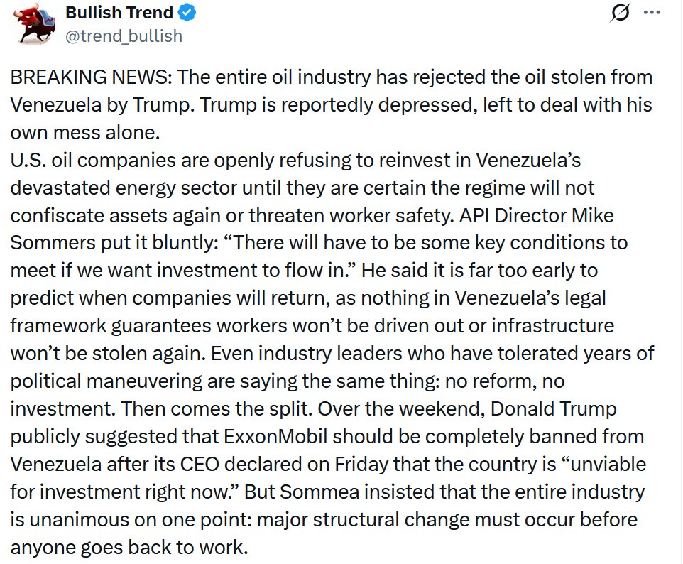 After an initial speedballer high from abducting Maduro, which surely emboldened Trump re Iran, reality has set in - namely, the Bolivarian revolution is going nowhere, and US oil majors don't want 'in'. Decline & Fall has the receipts: