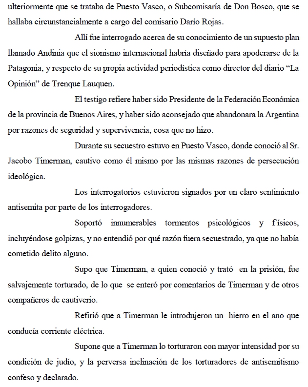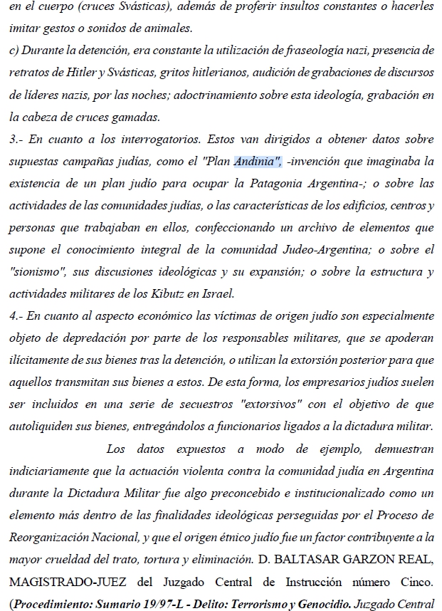 El juez español y defensor de los Derechos Humanos Baltasar Garzón lo reflejó en un fallo donde puso a la patraña del "Plan Andinia" en el centro de la ideología antisemita de la dictadura militar: (3 de 4)