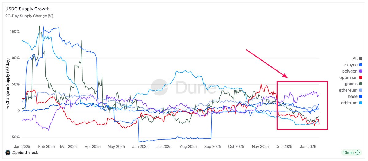 Since the end of November 2025, @0xPolygon has shown the largest increase in USDC supply in terms of percentage growth.