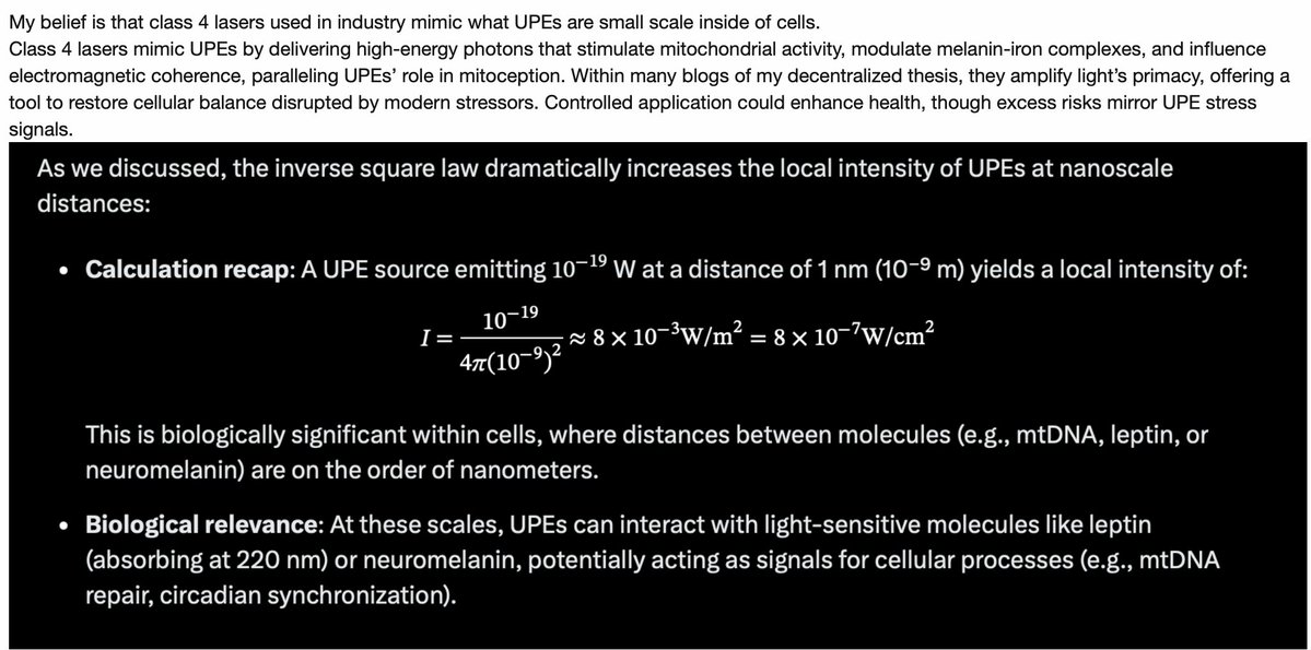 UPEs aren't mitochondrial noise; they're nanoscale lasers signaling via polarization, with melanin/dopamine as the evolved decoder. Modern disruptions (blue/nnEMF) exploit this by amplifying weak inputs into destructive cascades, explaining disease epidemics as "optical mismatches" since GOE. GAME SET MATCH MY SAVAGES.