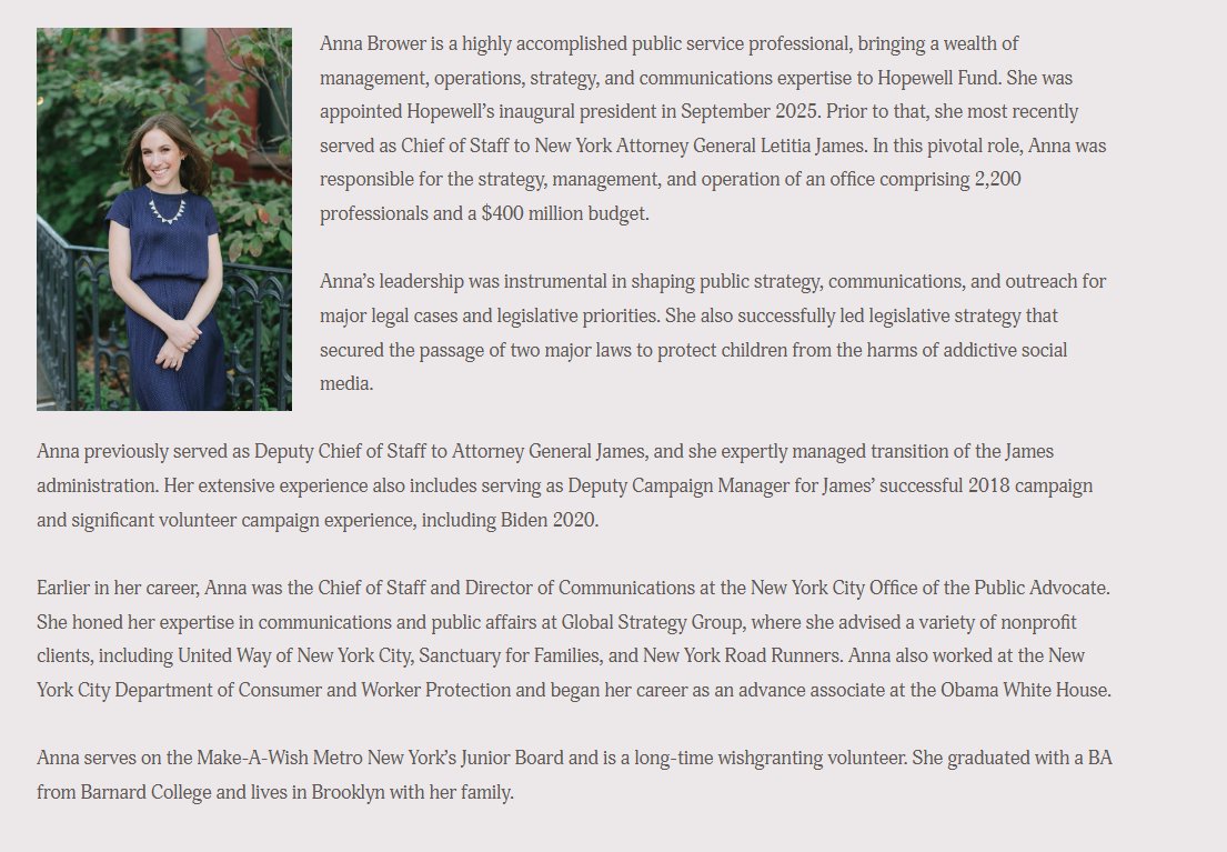 The new President of the Hopewell Fund is a woman named Anna Brower, who served as the Chief of Staff to New York State Attorney General Letitia James as well Deputy Campaign Manager for James back in 2018.