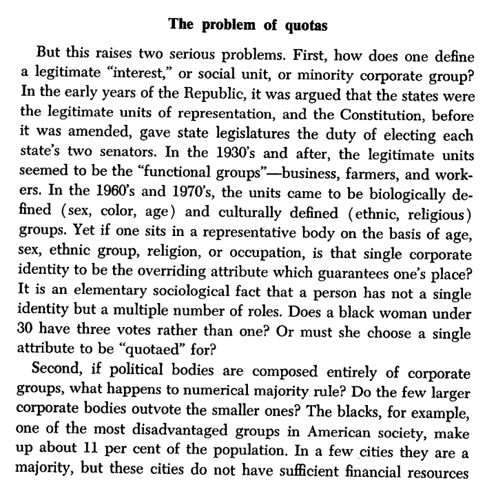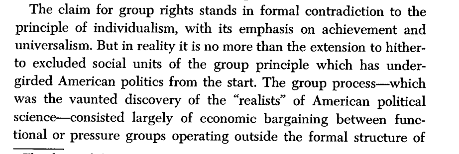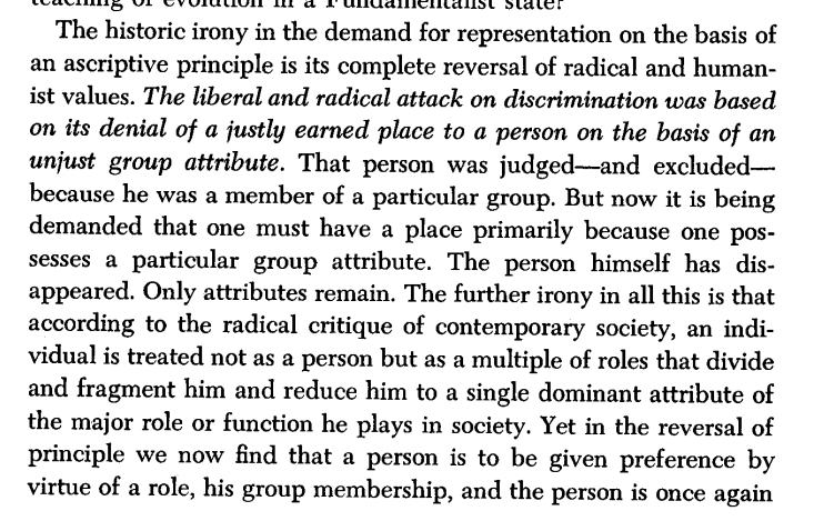 This successful 1960s attack on meritocracy in the form of affirmative action/Civil Rights *overthrew* the liberal individualist position that someone's place should not be based on their group attributes.