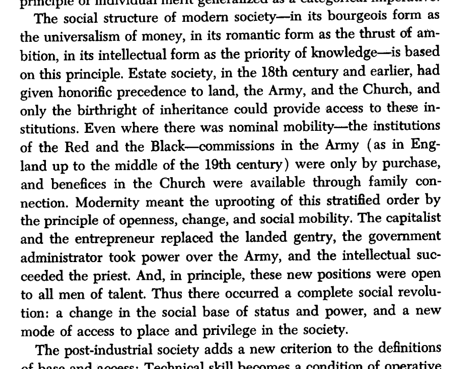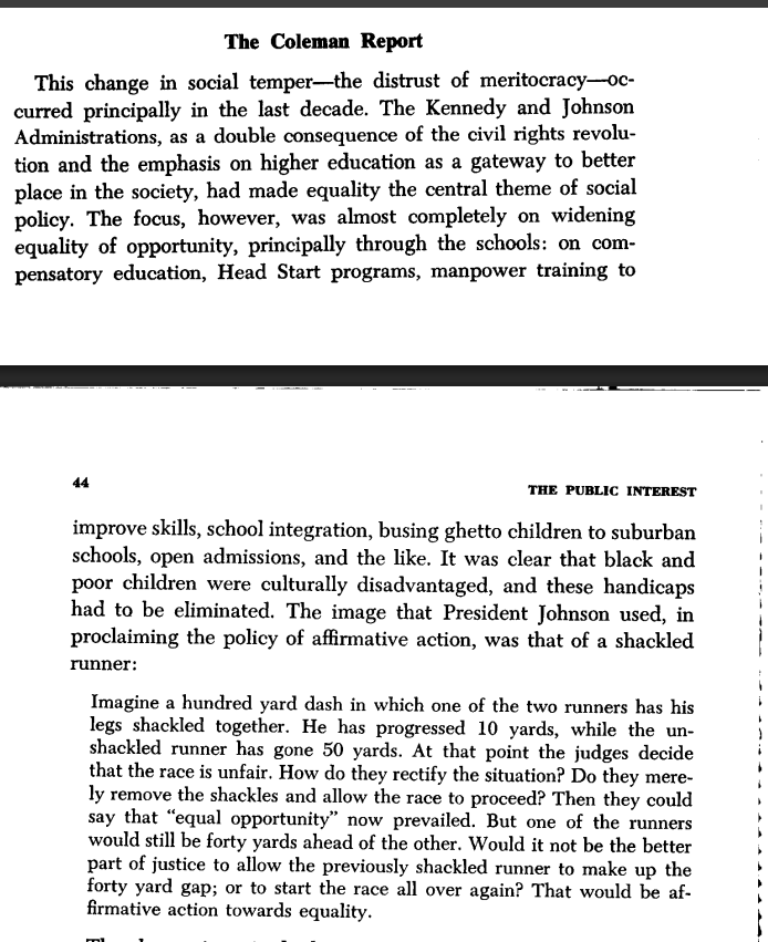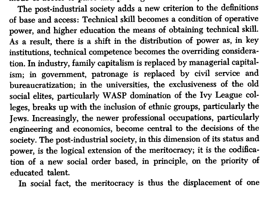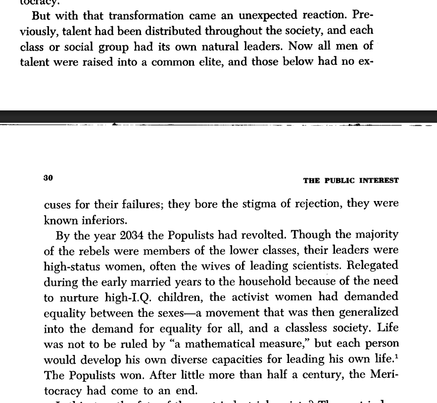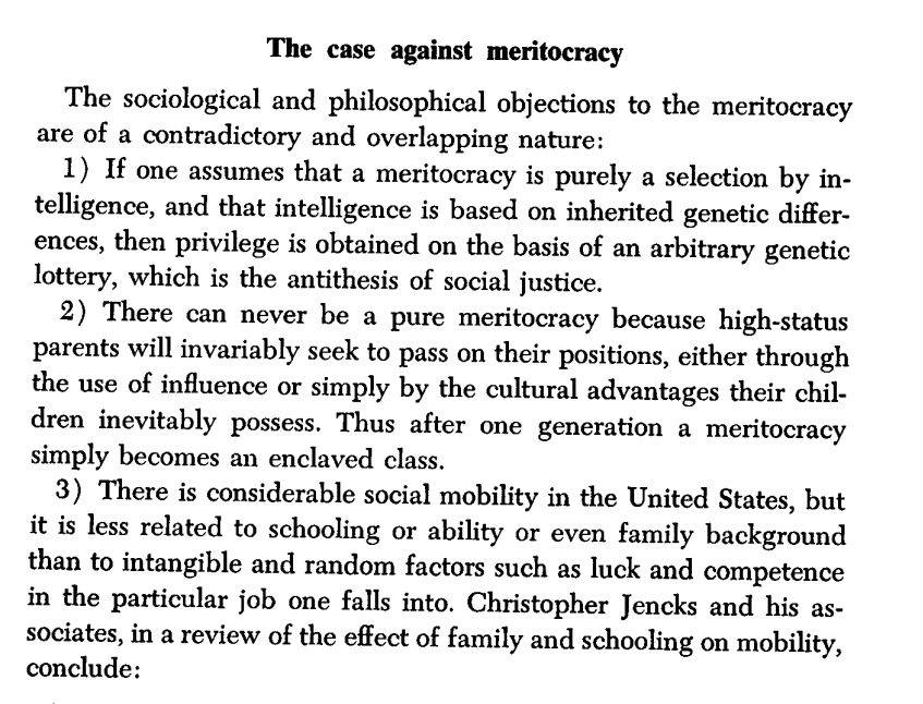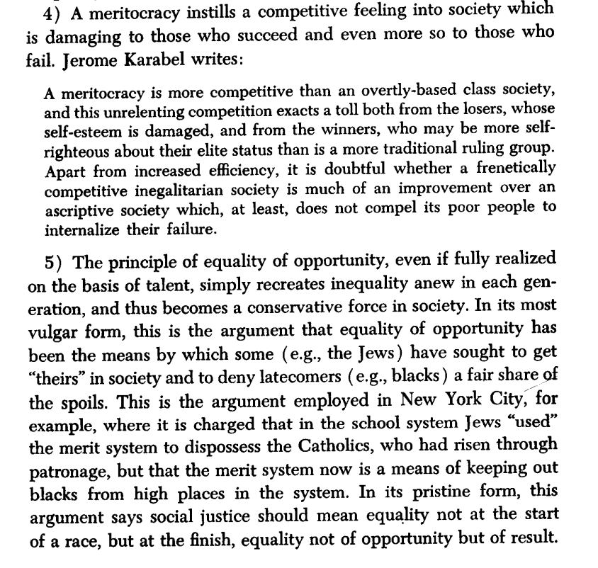 Thread with excerpts from the 1976 essay "On Meritocracy and Equality." I want to clear up some misconceptions around the idea of "meritocracy." The word was initially coined as a *pejorative* in 1958 to describe presently-existing Anglo-American society.