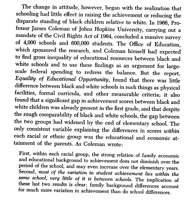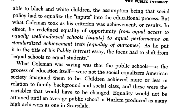 The author, Daniel Bell, traces this destruction of democracy to the failure of the mainstream Civil Rights movement, premised on the idea that equality of opportunity would lead to equality of results, a decade earlier with the 1966 Coleman Report.