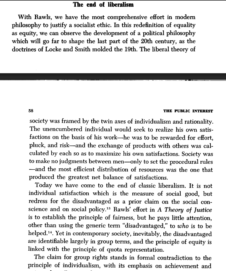 This represents the end of liberalism. The liberal ideal was to set no prescriptive ends, simply a set of procedural rules, and to let things work out as they may. The New Left overthrew and destroyed this in favor of redress for "disadvantaged groups" as the basis of society.