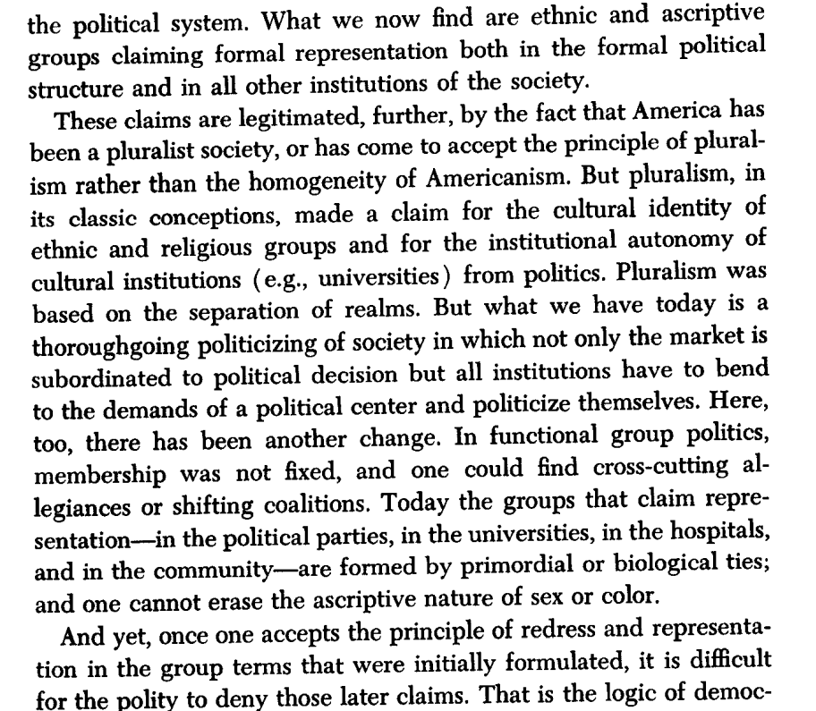 This should be seen, in my view, as a sort of "de-modernization" process. Rather than individuals equal under the law, we've returned to an ancien-regime like system of group representation, rights, and privileges, millets or estates or "communities" rather than citizens.