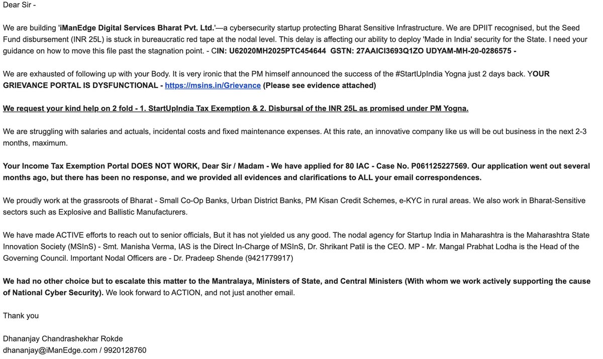 @PMOIndia @PiyushGoyal @startupindia @nsitharaman @SHRIKANTPATIL99 @mlodha Out of sheer frustration, fatigue and imminent threat of closure of innovative Cyber-GRC-AI-Agentic AI #MakeInIndia Startup - We have written to you. Employees will remain unpaid - Thanks to the false promises and the reluctance of issuance of Sec 80 IAC. Image