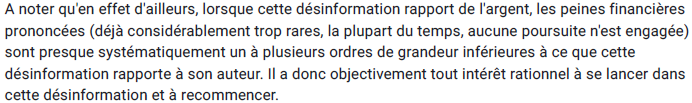 @DgCostagliola @hervemaison @MathieuMolimard @stephanie_rist 7/ Quand désinformer rapporte davantage de pognon que n'en coûte sa condamnation c'est un encouragement RATIONNEL à désinformer.