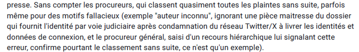6) Supprimer le fonctionnement territorialisé de la justice dès lors qu'une plainte ou civile ou pénale concerne internet ou les médias (un parquet national contre la haine en ligne existe déjà, mais les plaintes devraient être systématiquement et automatiquement confiées à un pôle national et traitées par celui-ci, avec des moyens centuplés, et ne pas concerner que la haine en ligne mais tout ce qui est dans les médias ou sur internet, au civil comme au pénal).🔽Image