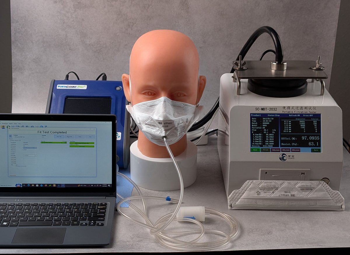 I tested the masks on a silicone mask testing headform. This helps make sure that the filter area that air can go through is similar to when the mask is worn. I connected the headform to a Scince filter testing machine using the 85 liter per minute airflow setting - the airflow rate that NIOSH uses.