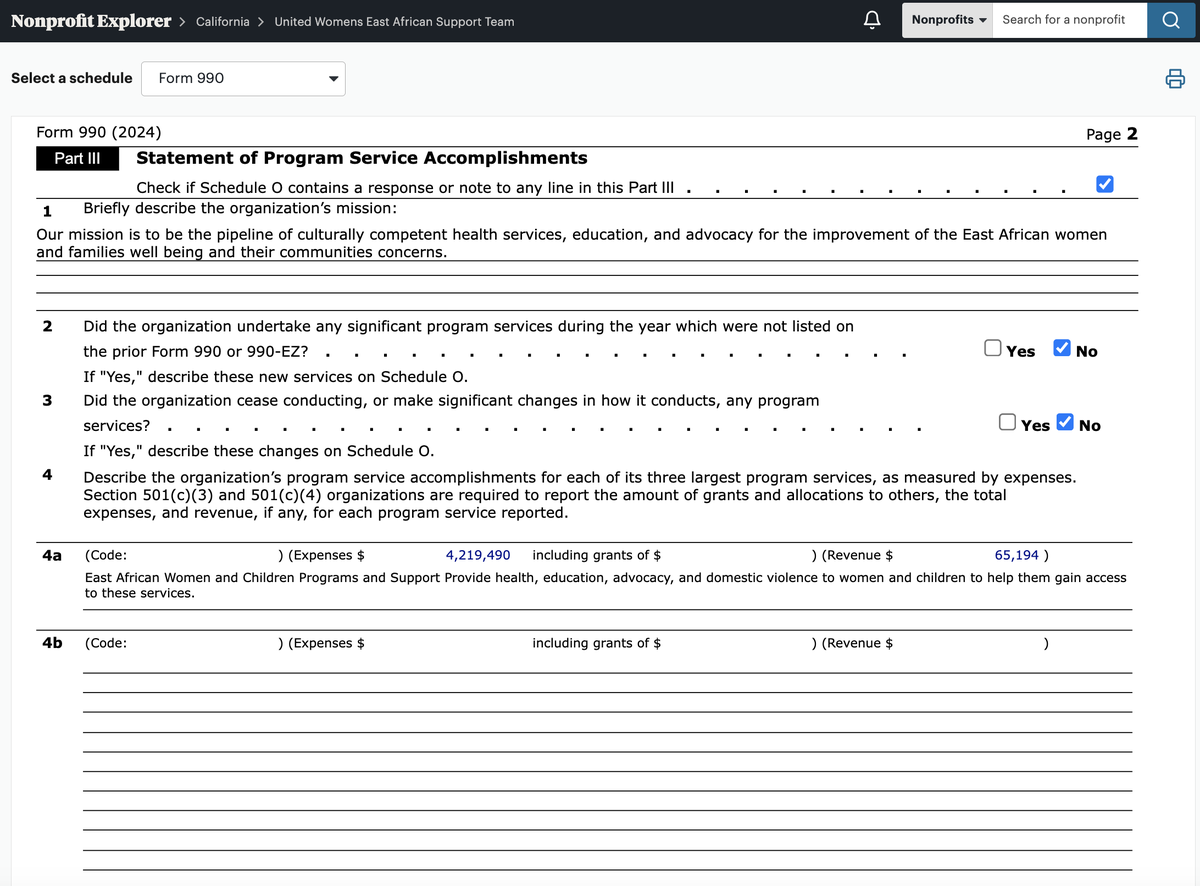 Well they provide Grants to about 2000 other NGO's in San Diego and around the world... 👀 one of which happens to be UNITED WOMEN OF EAST AFRICA SUPPORT TEAM where they receive $1,584,405 in Grant aid from them and $7,663,535 in Total Contributions where $2,338,309 goes to "Other Salaries" of which only $190,953 is listed for the Executive Director... they do have 8 Directors with no salaries listed which is interesting but we'll come back to that. Anyway, I decided to look a little deeper because this felt odd for "San Diego".