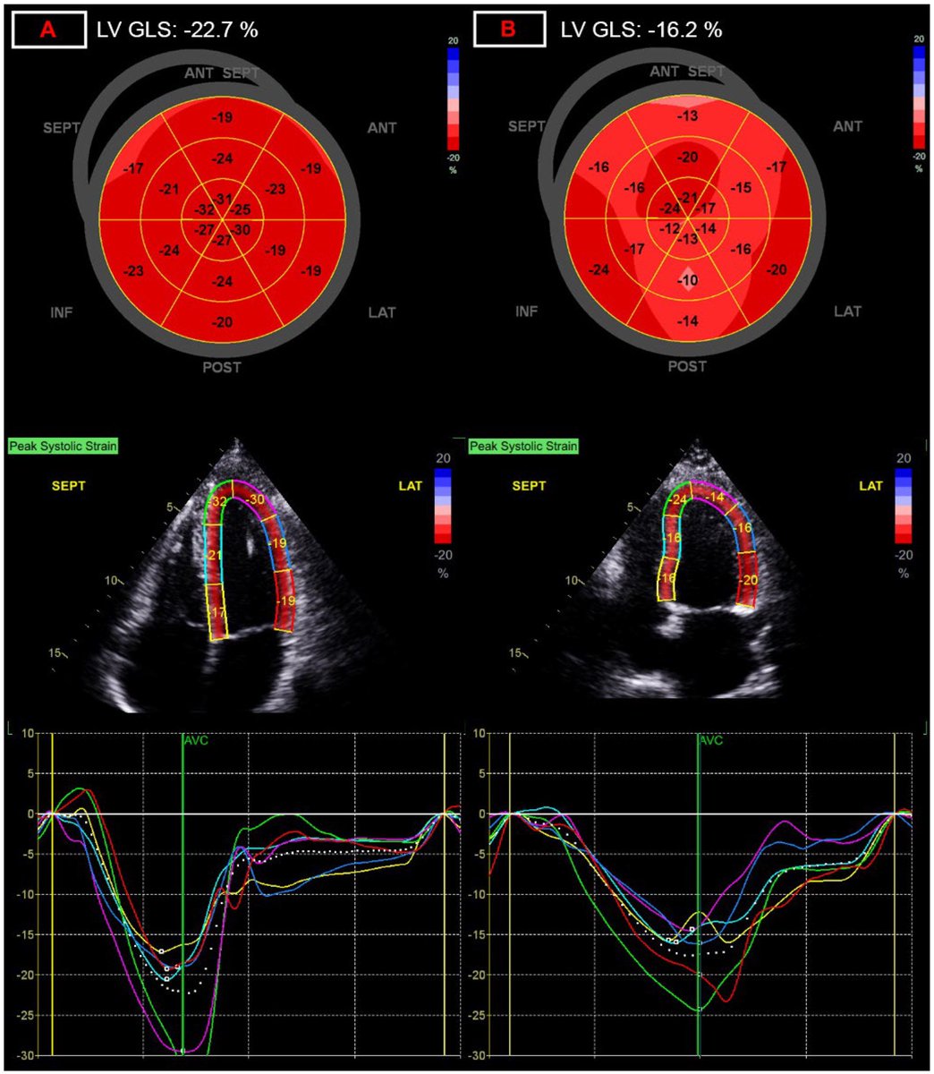 Despite normal conventional echocardiographic parameters, GLS was significantly reduced — indicating subclinical myocardial dysfunction that would otherwise be missed on routine echo. 1/