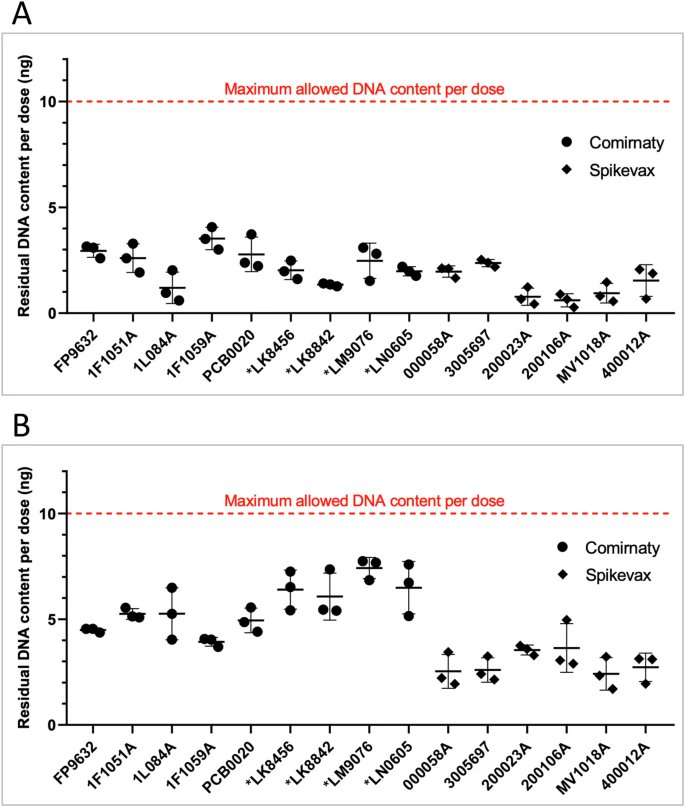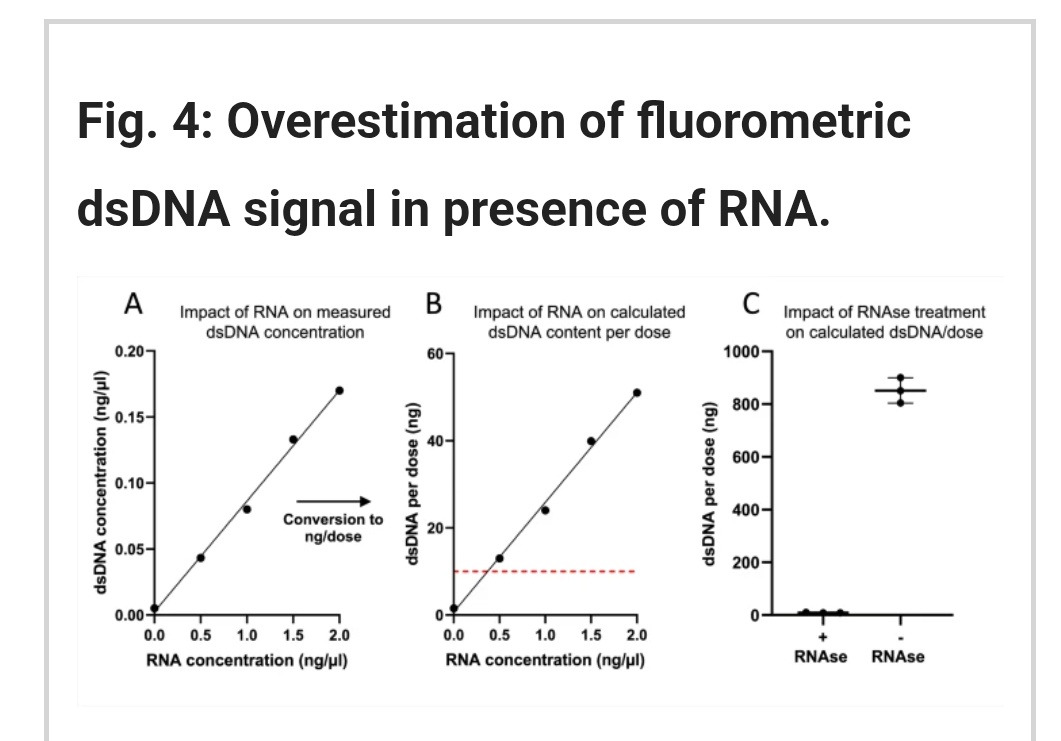 Il colorante, con una quantità enorme di RNA come nei vaccini, può legarsi anche a quello e quindi i "livelli elevati di DNA" nei risultati sono sostanzialmente gonfiati da tutto l'RNA presente. La prova è nello studio. Con l'RNA puro, l'analisi rileva segnale di DNA. 4/7
