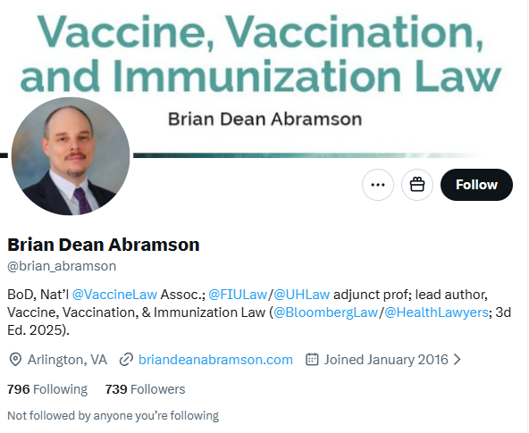 The founder of the Vaccine Law Association @vaccinelaw is Brian Dean Abramson.