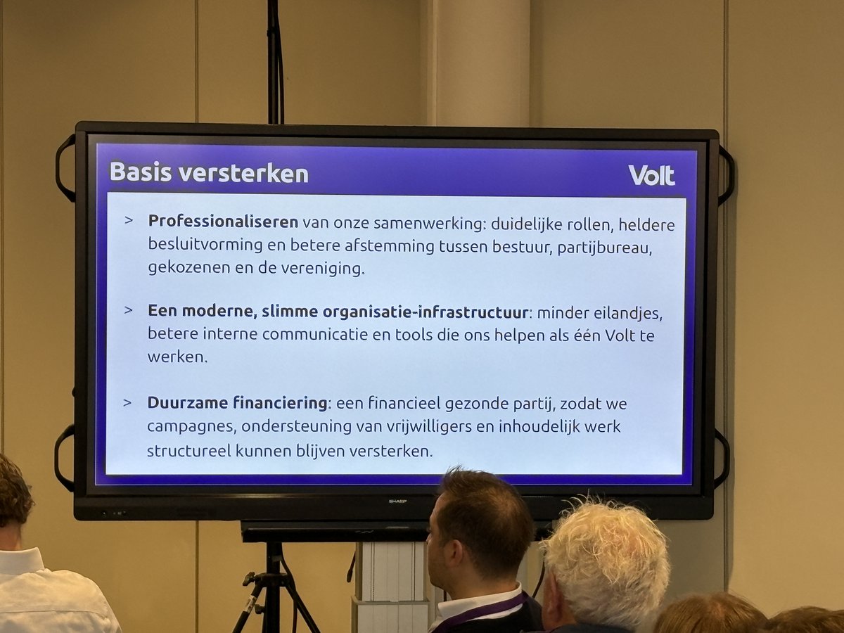 Er zijn nu alleen algemene vragen. Specifieke vragen in de break-out sessie. Strategie heet 'RE:ALIGN 29' zie ik op de slide. Man in publiek zegt dat het programma links was, terwijl je nu steeds hoort dat Volt liberaal is. Programma was niet echt liberaal.