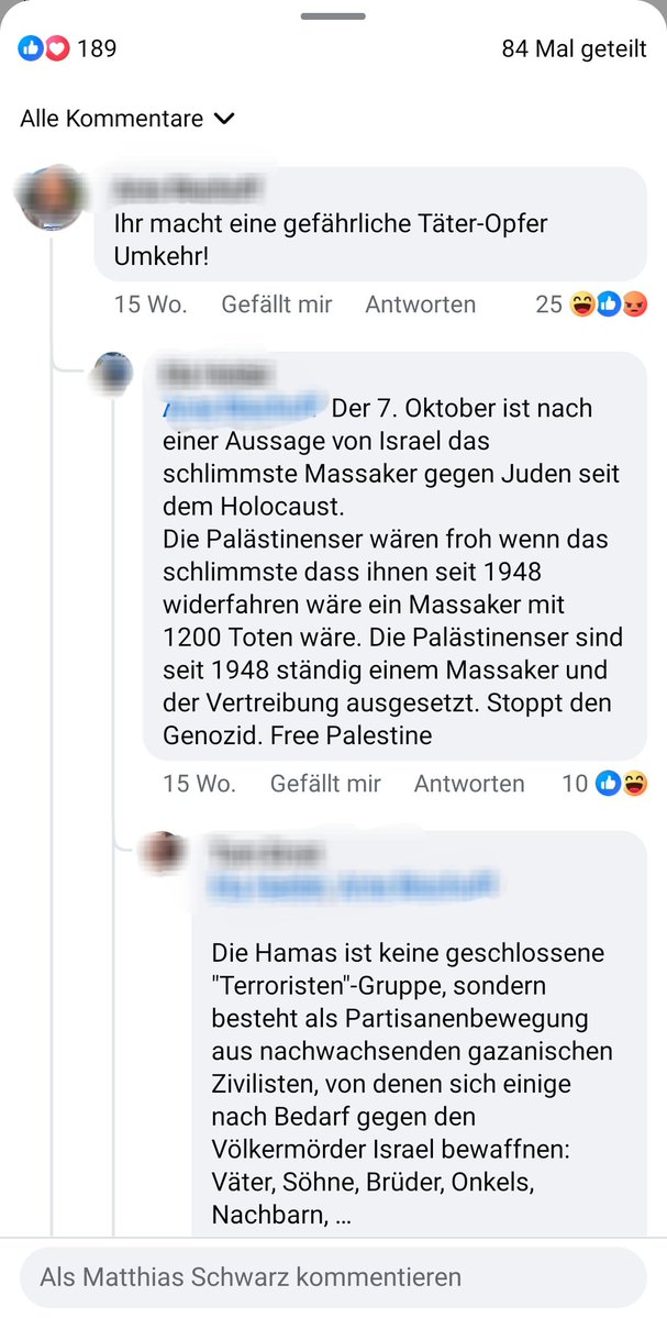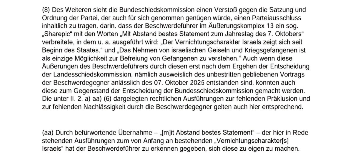 Erwähnenswert ist dies, weil der Beitrag und "Sharepics" auch im Rahmen eines Parteiausschlussverfahrens von der Bundesschiedskommision der Partei "Die Linke" explizit als Ausschlussgrund benannt wurde.