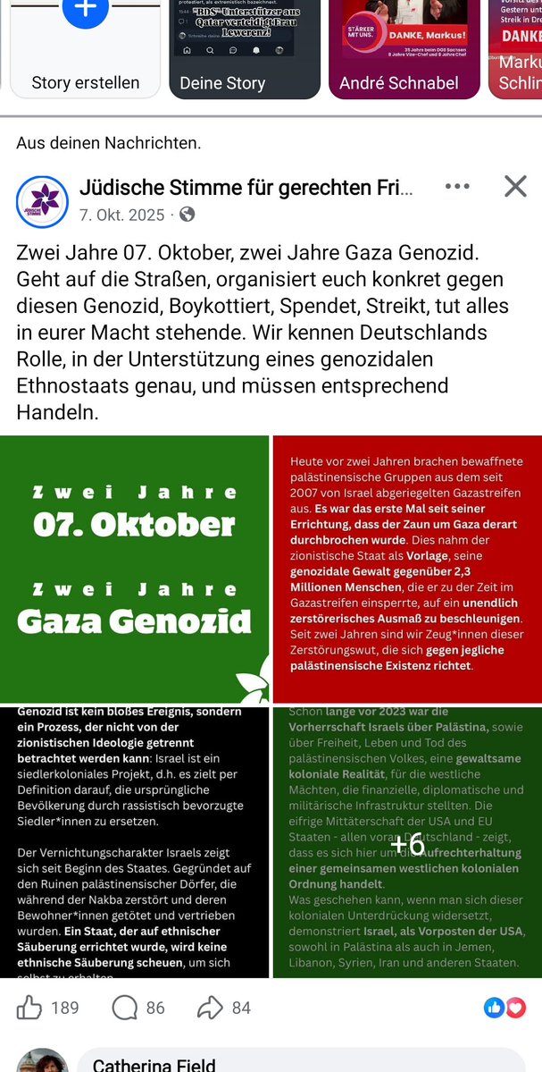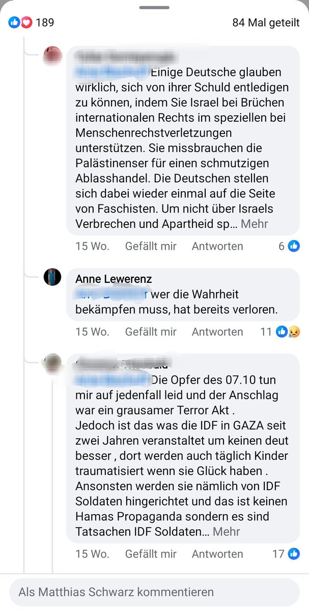 Darüber hinaus sprach Frau Lewerenz auf ihrem Facebook-Profil und bei "Threads" von einer [Zitaz] "Endlösung der Judenfrage", welche #Israel und seine Regierung im Gaza-Streifen verfolgen würde. Israel sei ein "Judonazi"-Staat und Israelis wahlweise "Judonazis" od. "Judäo-Nazis".