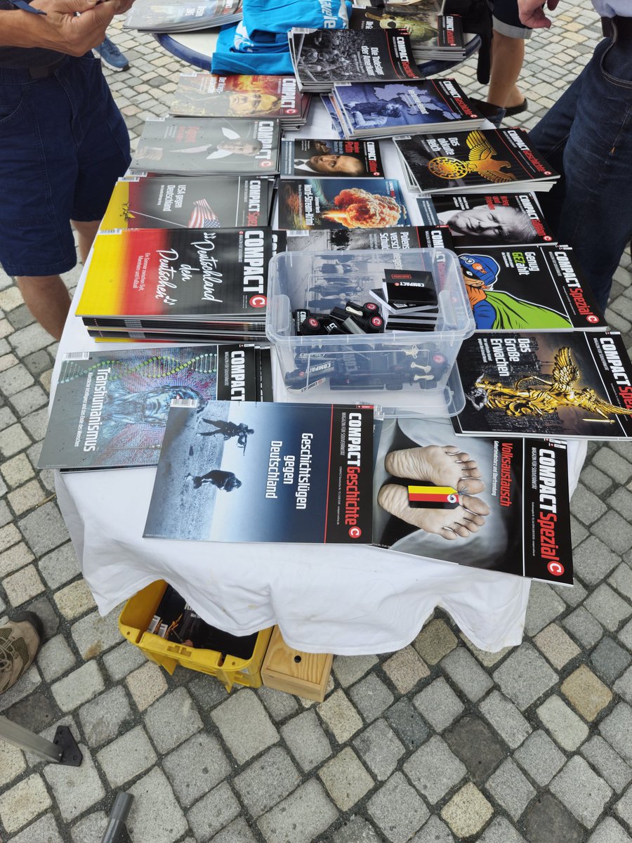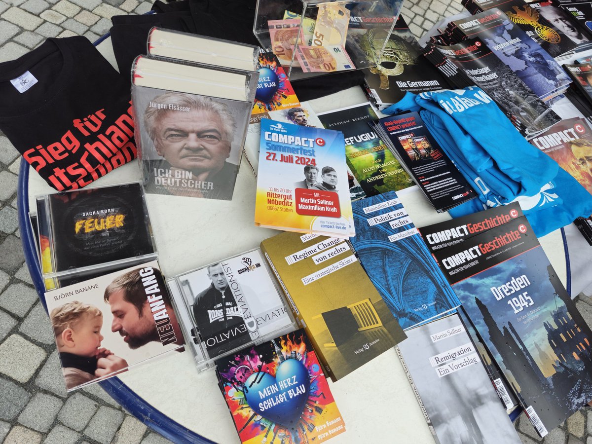 Am Stand von Compact liegen ihre Zeitschriften aus, etwas Merchandising, aber auch Hefte von Maximilian Krah und Martin Sellner aus dem Verlag von Götz Kubitschek.