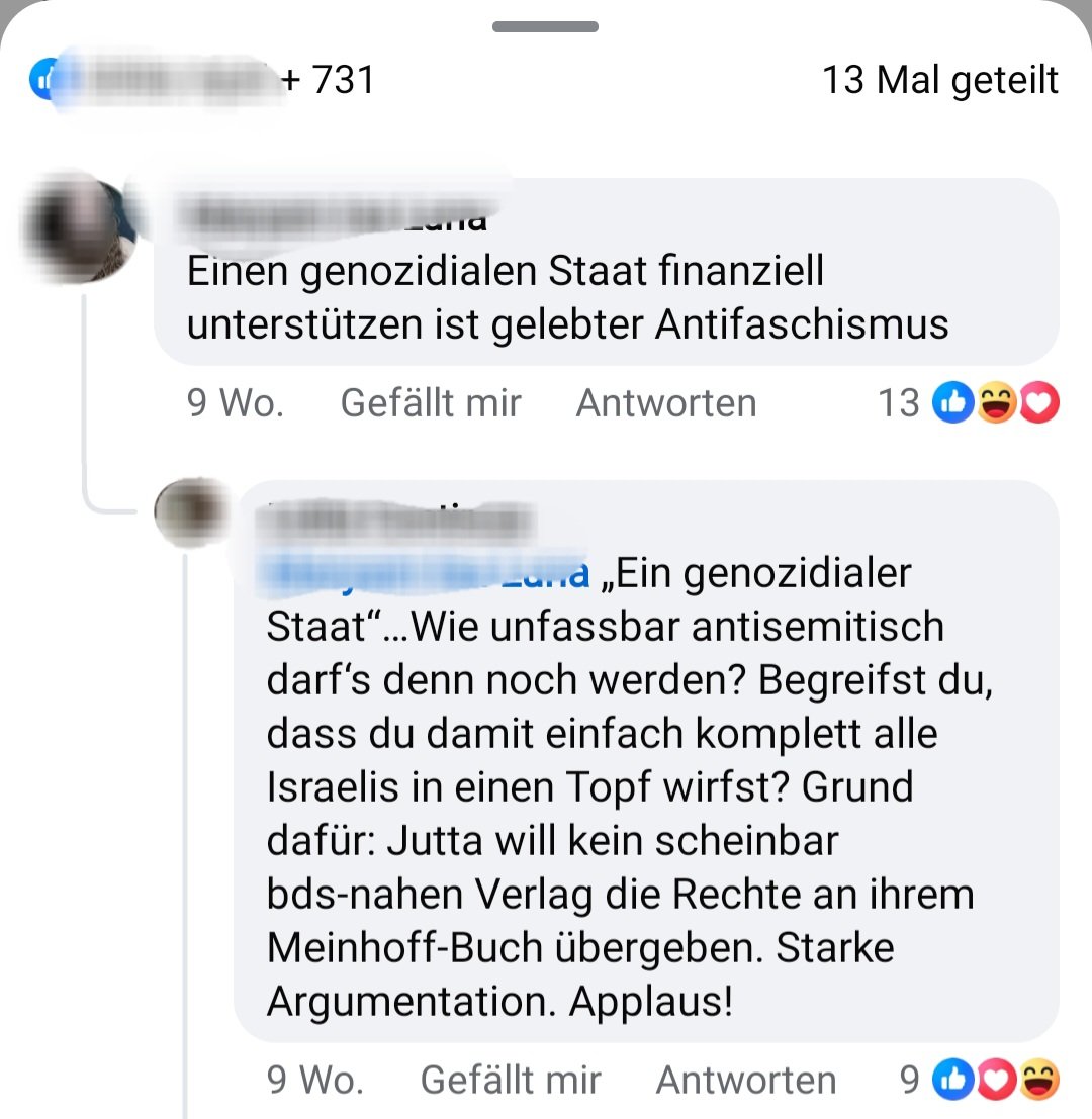 Der von Frau Lewerenz offenbarte #Antisemitismus - einschließlich Bewerbung der antisemitischen "BDS-Bewegung" -lässt sich auch in Kommentaren unter einem Beitrag von @jutta_ditfurth [] nachvollziehen: facebook.com/share/17xGFg1m…