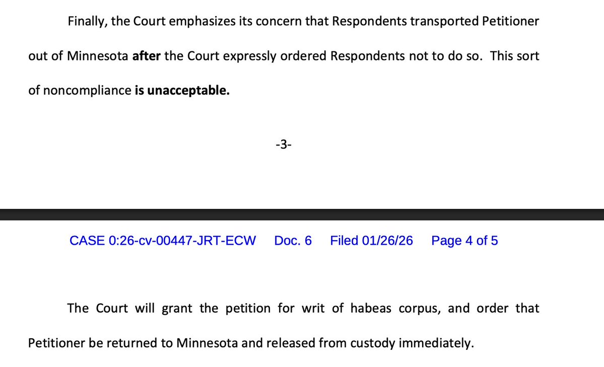 UPDATE: Judge Tunheim in Minnesota blasts DOJ for racing to move an immigration detainee to Texas despite his order to keep the person in MN. This has become a repeat issue – ICE racing to move detainees out of state, which affects legal rights.