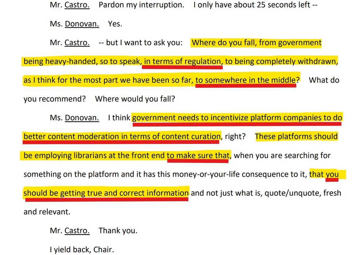 8) A telling moment in the 2020 intelligence hearing was Castro egging on Joan Donovan (don't get me started), who ran Harvard's Misinformation Review, to get her to suggest as an expert that the government needed to do more to regulate social media, to force content moderation