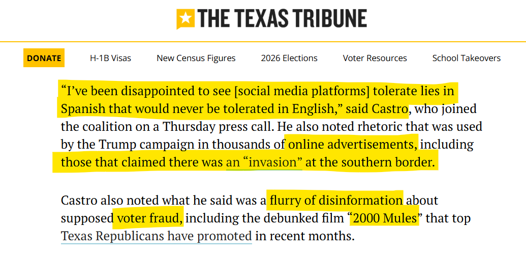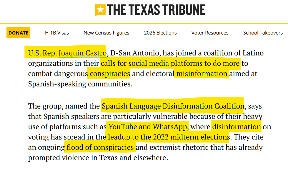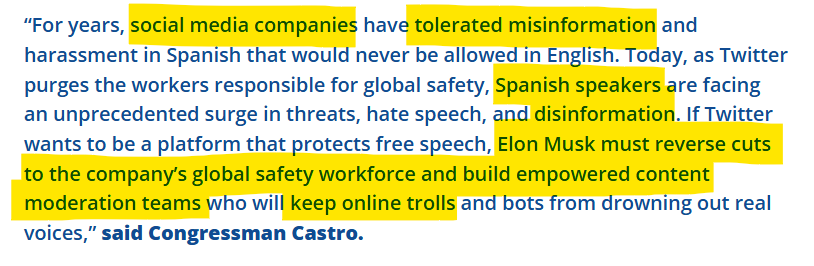 13) "Spanish-language disinfo" would become Castro's club after the 3 big censorship predicates ("Russian disinfo," Covid misinfo, 2020 election misinfo) ran out of juice. When Elon fired X's Trust & Safety team, Castro demanded the censors be re-hired, citing Spanish disinfo