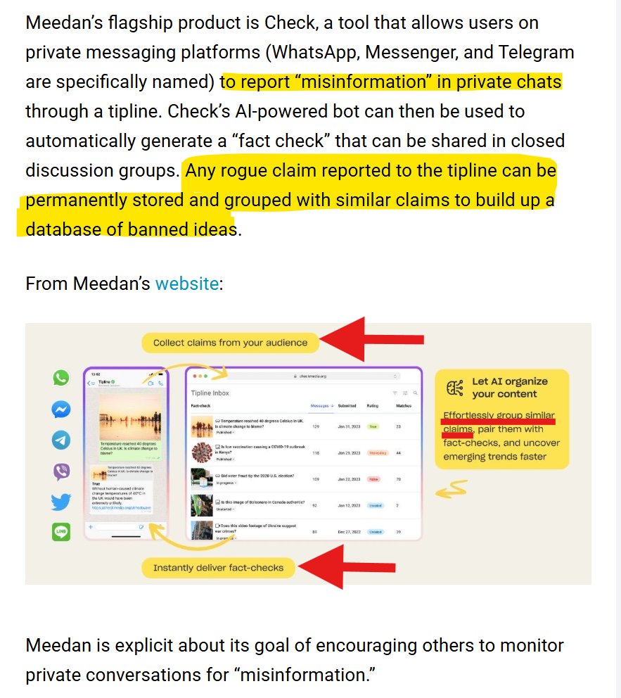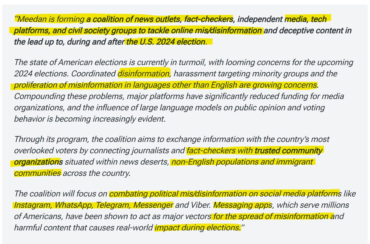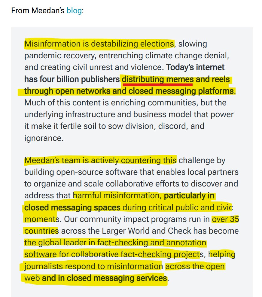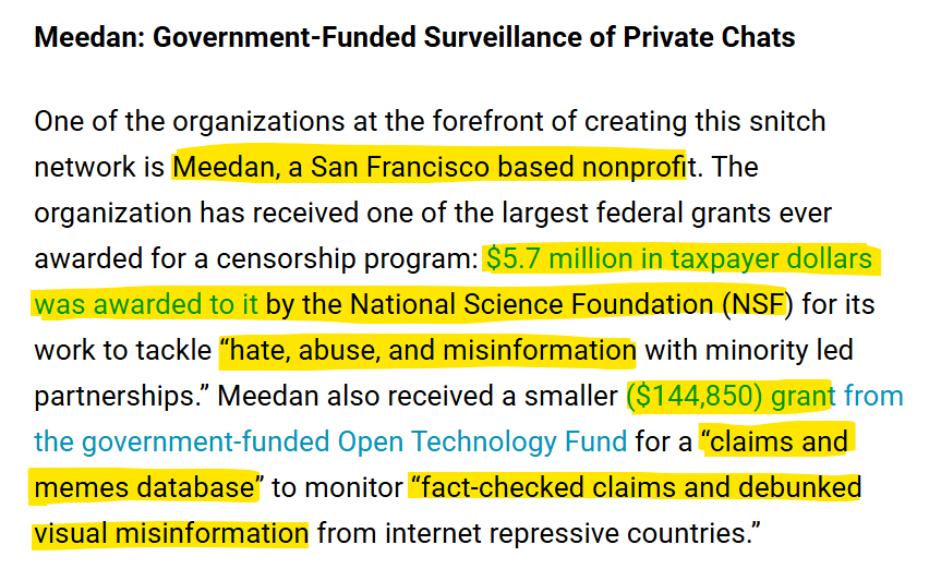 16) While NED's censorship tech developer Meedan was censoring US elections, it received nearly $6 million in tax dollars from the Biden admin to censor "misinformation" and build a "claims and memes database" to pre-censor the sharing of memes on social media & in private chats