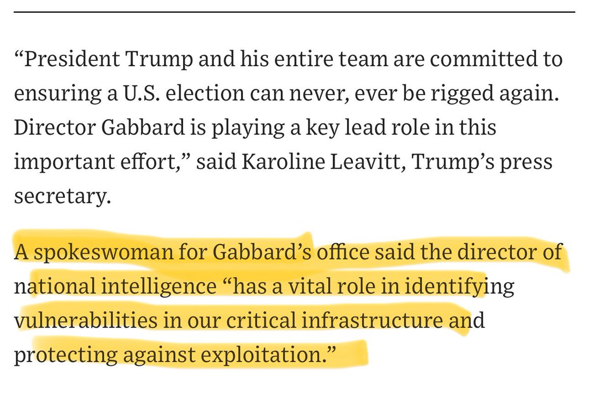 ‘Gabbard’s office said the director of national intelligence “has a vital role in identifying vulnerabilities in our critical infrastructure and protecting against exploitation.”’