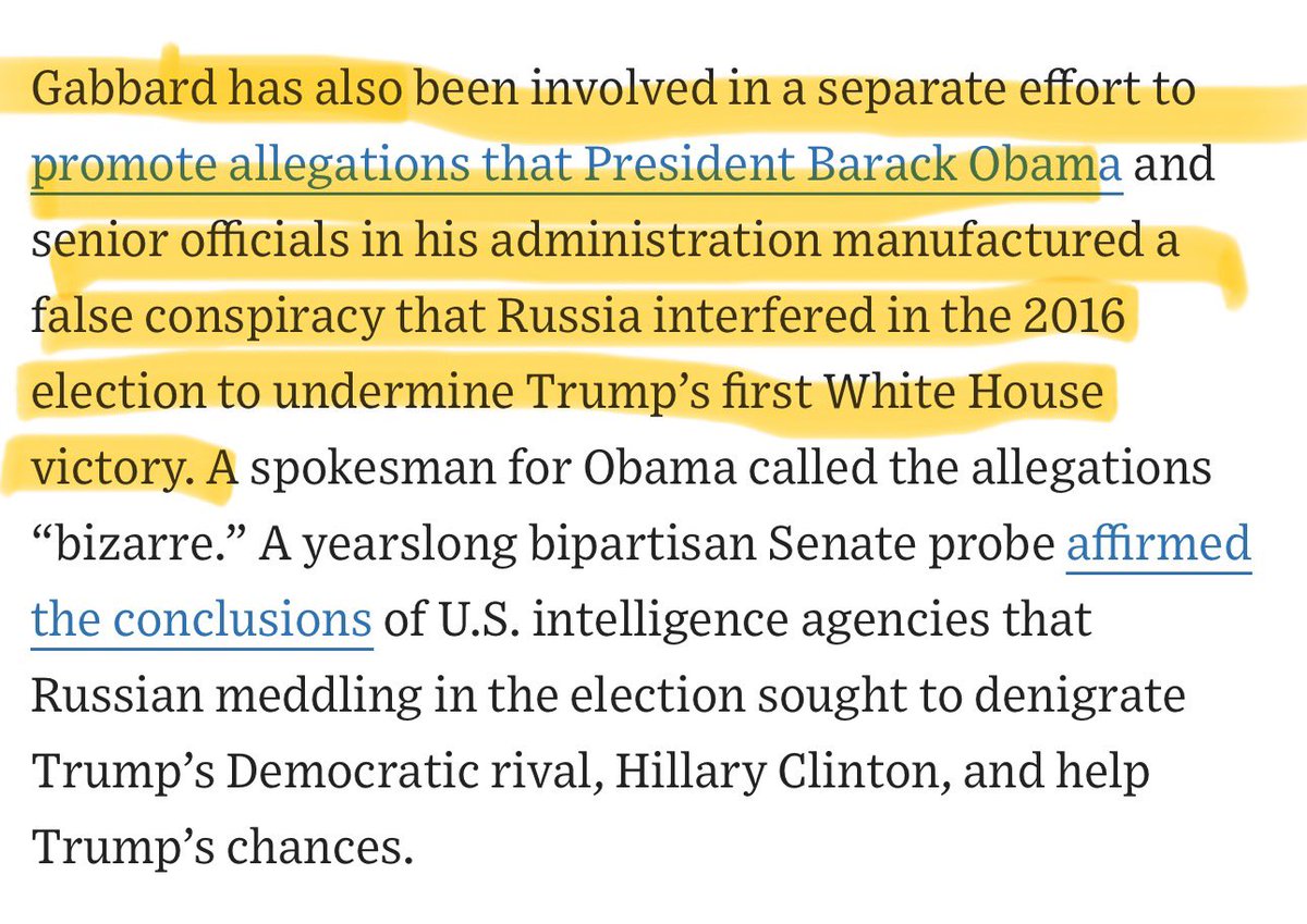 “Gabbard has also been involved in a separate effort to promote allegations that President Barack Obama and senior officials in his administration manufactured a false conspiracy that Russia interfered in the 2016 election to undermine Trump’s first White House victory.”