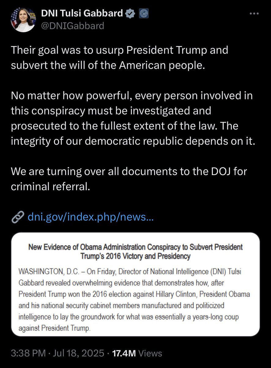 @DNIGabbard ‘s work on weaponization of intelligence in the 2016 election resulted in: