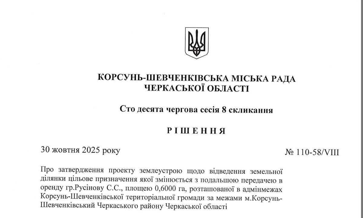 3 грудня 2025 Сергій Русінов отримав в оренду на 49 років від Корсунь-Шевченківської міської ради.