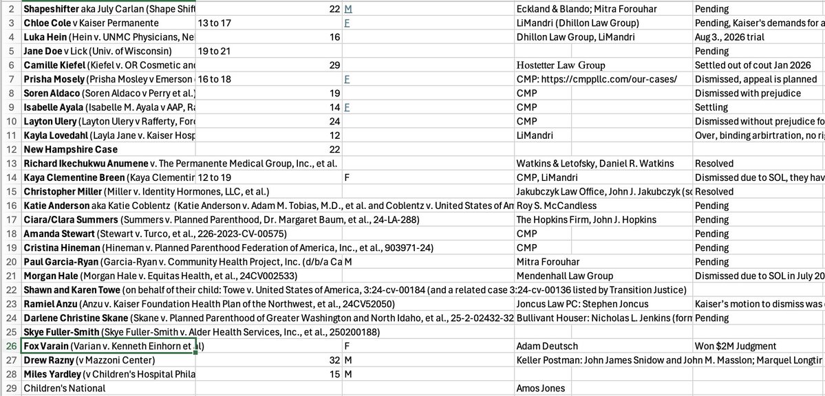 I have identified 28 detransitioner lawsuits filed to date. Varian v. Einhorn was the first to go to trial and the first to win a judgment, making history. If anyone knows of any additional cases that are not on my spreadsheet below or sees any errors, please DM me.