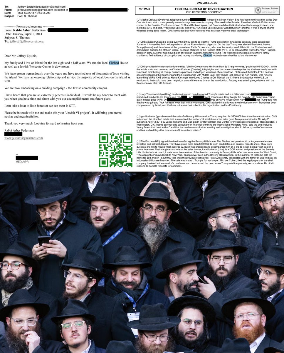 "(U)CHS advised Chabad is doing everything they can to co-opt the Trump presidency. Chabad is basically state-sanctioned Judaism. It is used by Putin to keep tabs on all the Russo-Jewish oligarchs. On the day Trump was elected President. @IvankaTrump (Ivanka) and Jared were at the gravesite of Rabbi Scheersom, who was the most powerful Rabbi in the Chabad network. Jared didn't disclose his stake in Cadre, because of its ties to the Russian state (NFI). CHS believed this was/is the "real" Russian collusion story. Kushner has moved a lot of Russian investment money around. The @FBI should investigate Kushner's family charities to find evidence of corruption and money laundering. Chabad routinely uses charities to launder money."